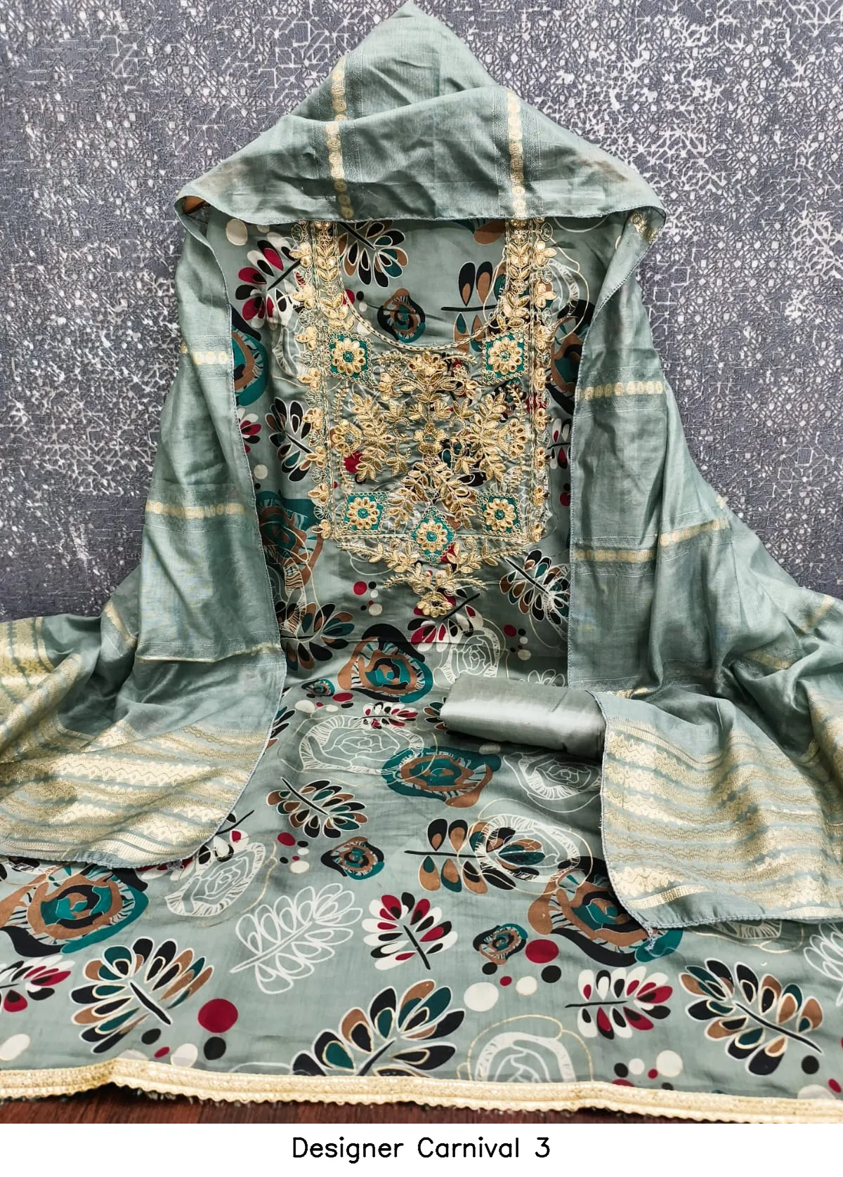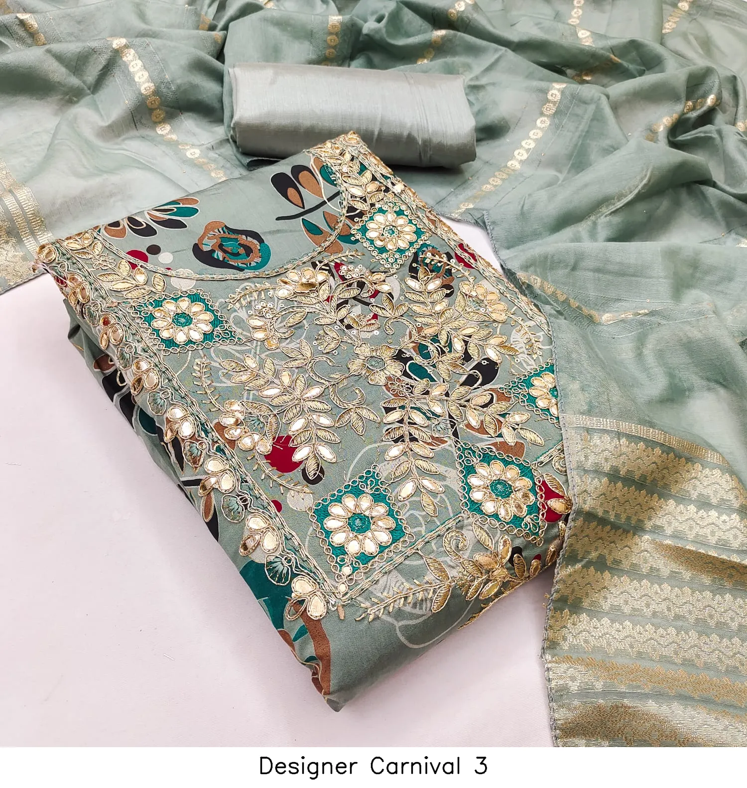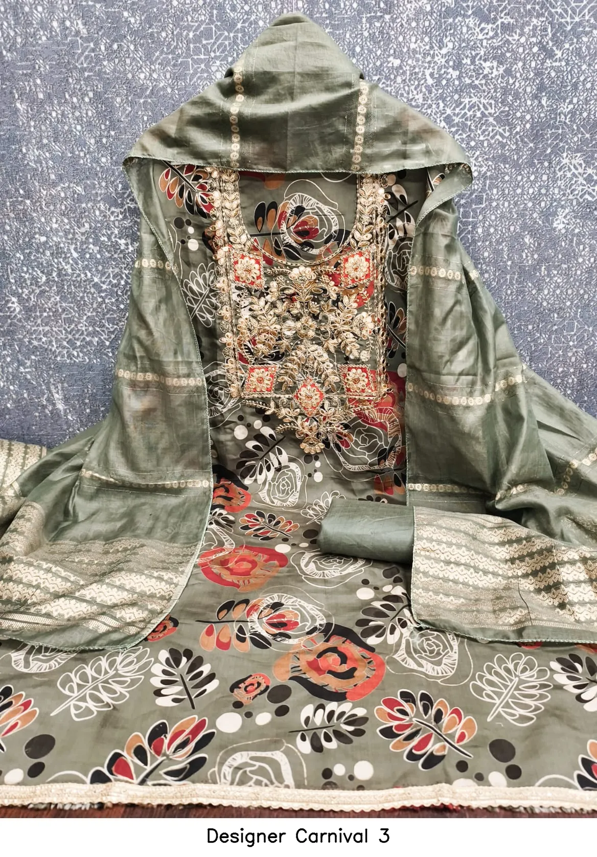 Details Top Fabric : Roman Front & Black Print with Kodding Squance Work Bottom : Santoon Dupatta : Chanderi Zakard