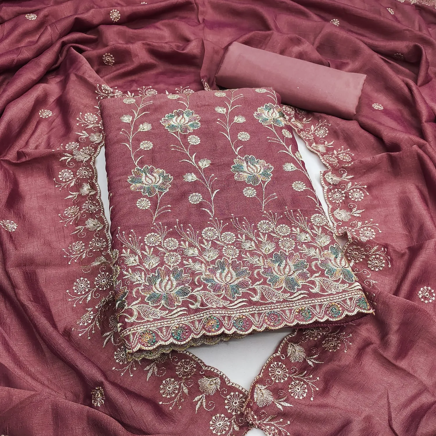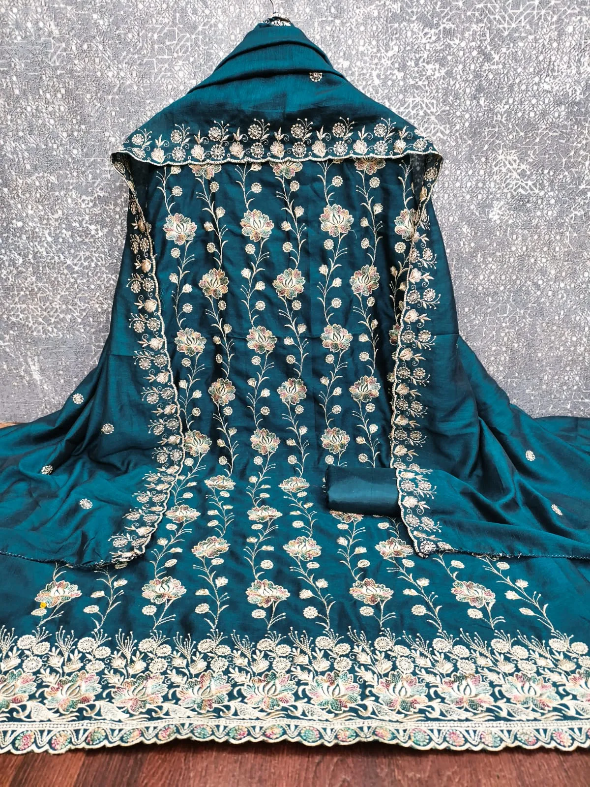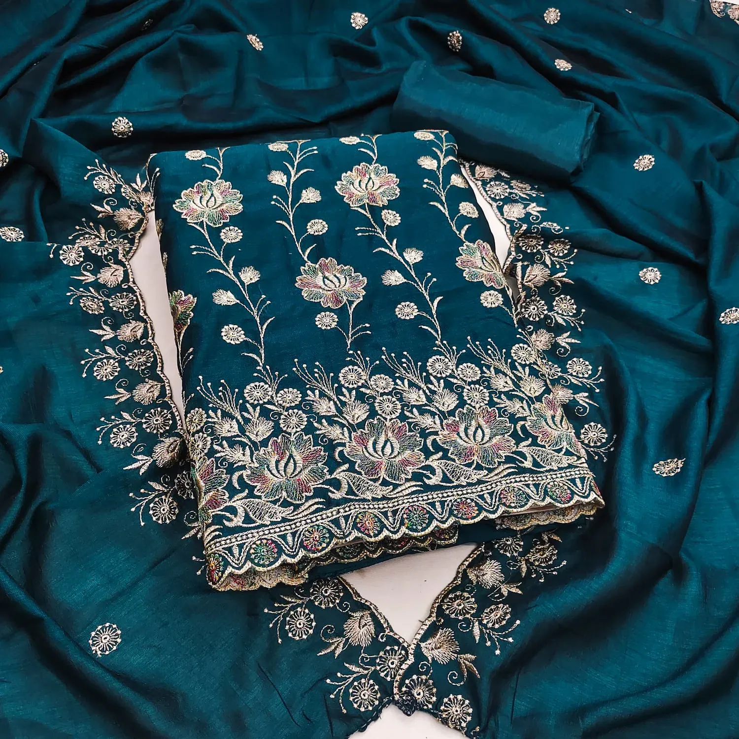 | Details | Top Fabrics : Vichitra Silk Multi Work Bottom Fabric : Santoon Dupattas Fabric : Vichitra Silk Work |