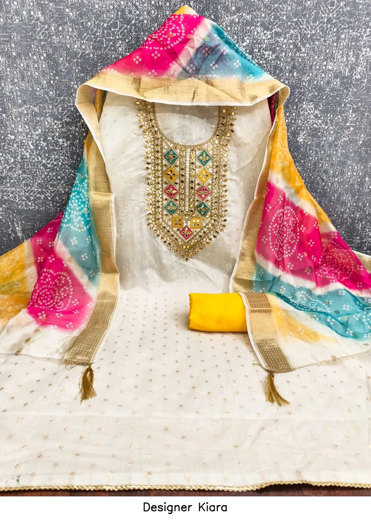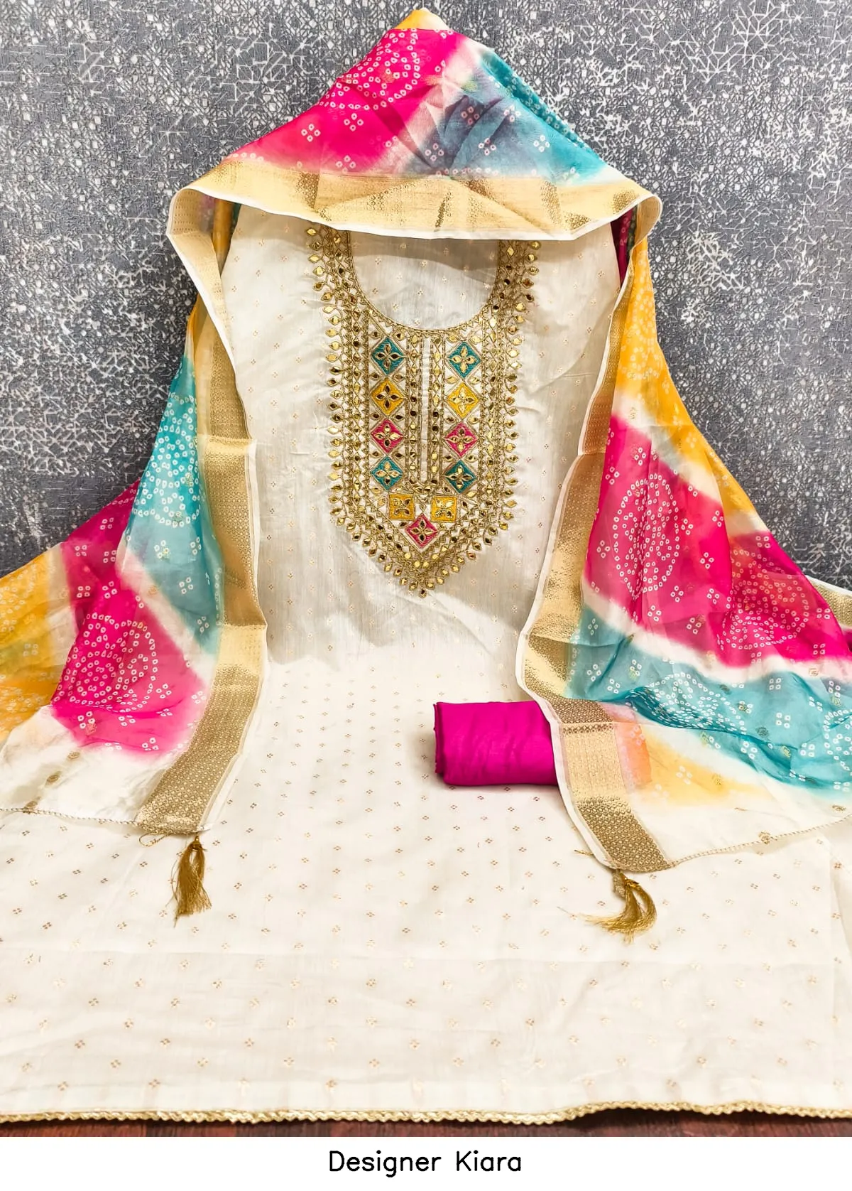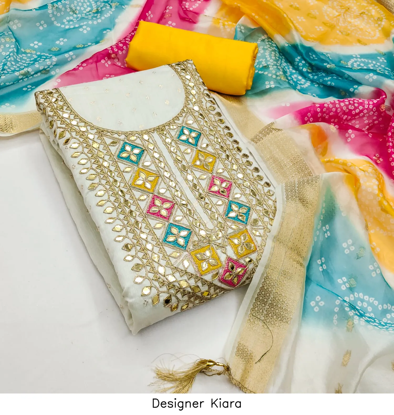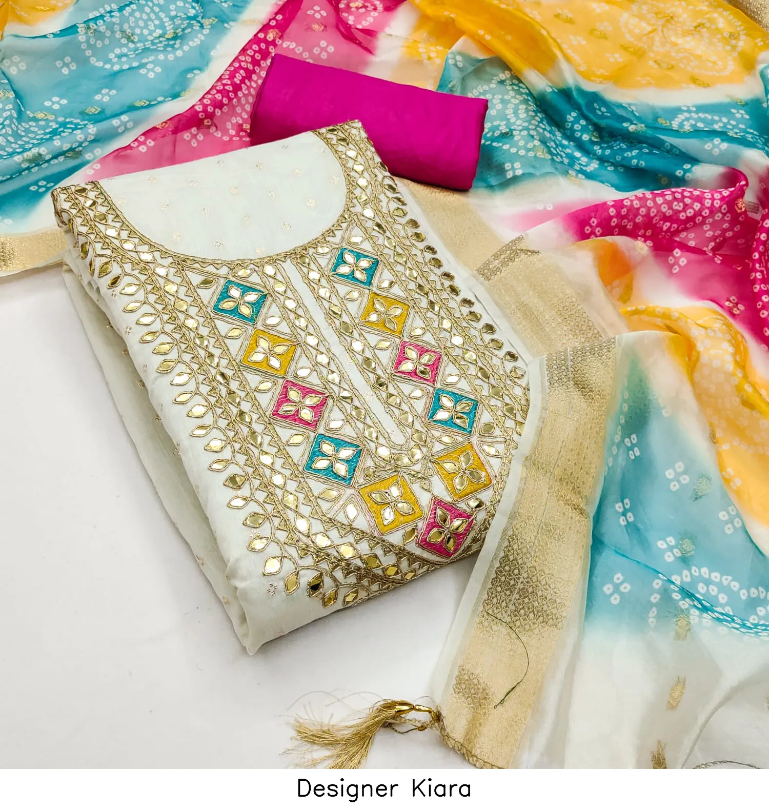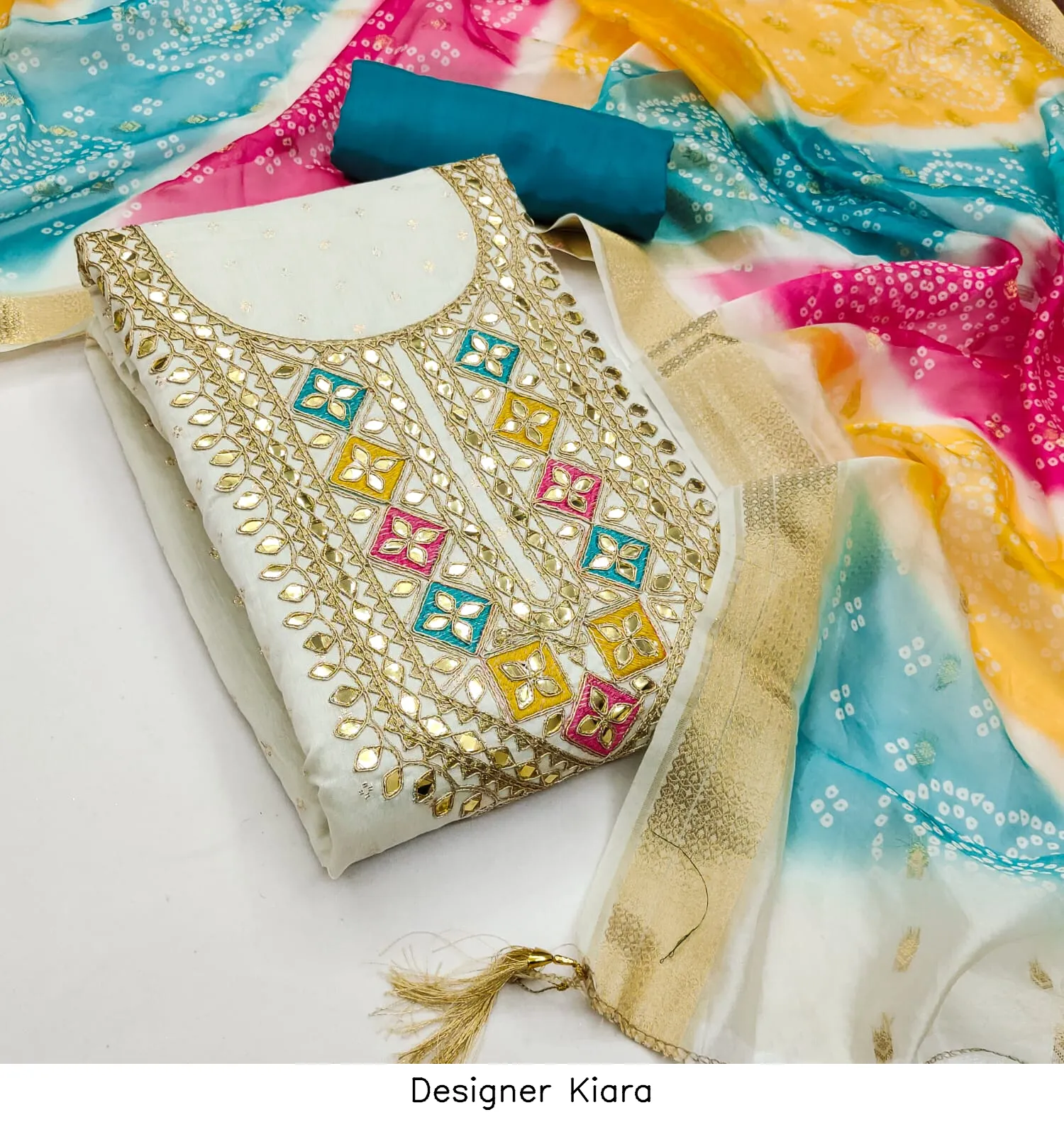 | Details | Top Fabric : Modal Rajvadi Booti Kodding Gotapatti Work Bottom : Santoon Dupatta : Organza Silk Zakard Digital Print |