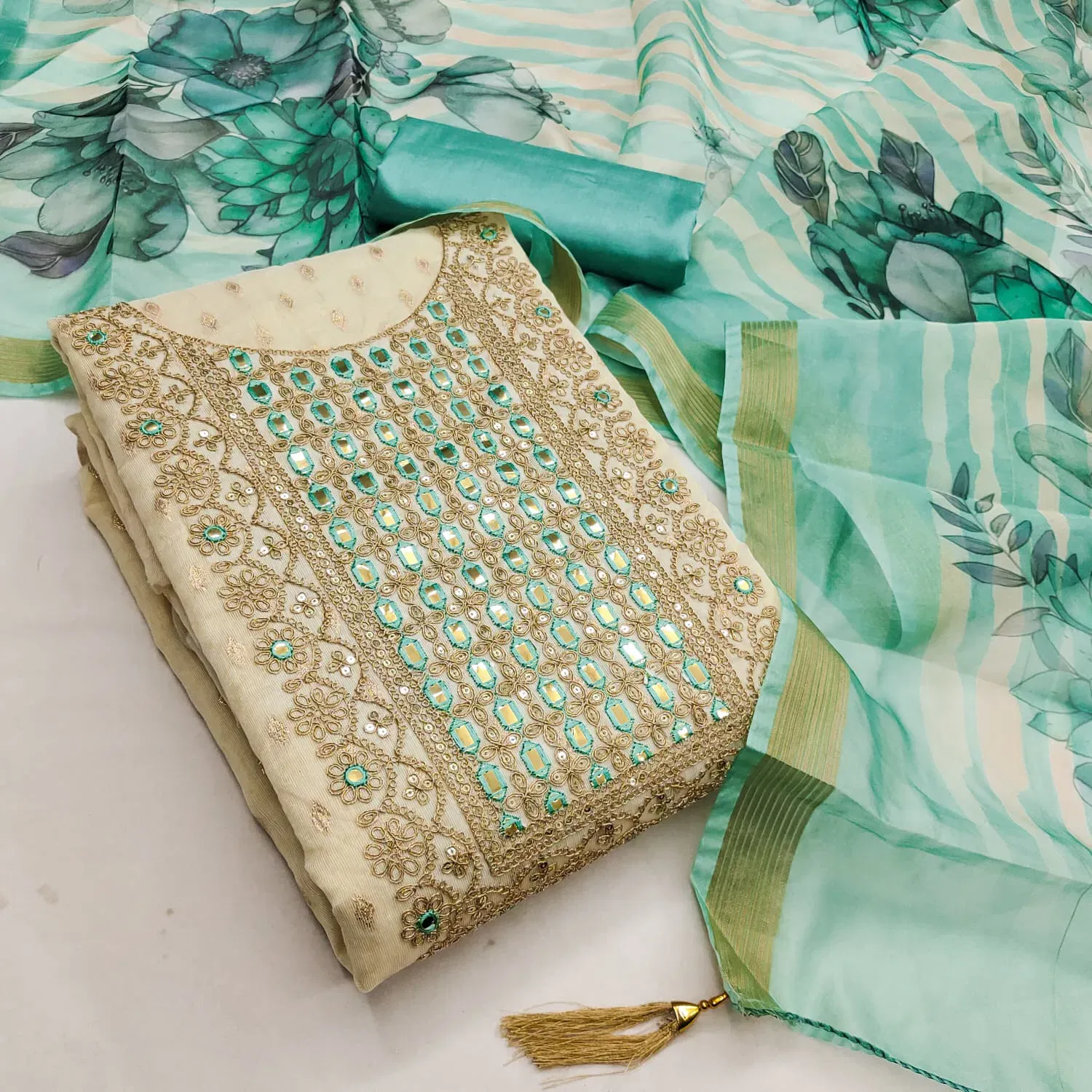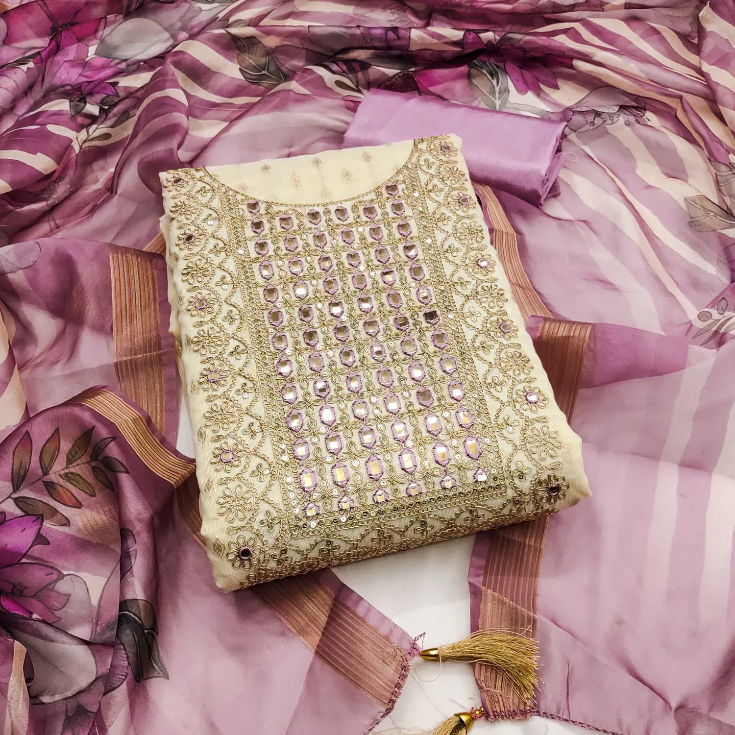 | Details | Top Fabrics:- Simmer Zakard Booti Kodding Mirror Work Bottom : Inner Fabrics : Santoon Duppata : Organza Silk Zakard Digital Print |
