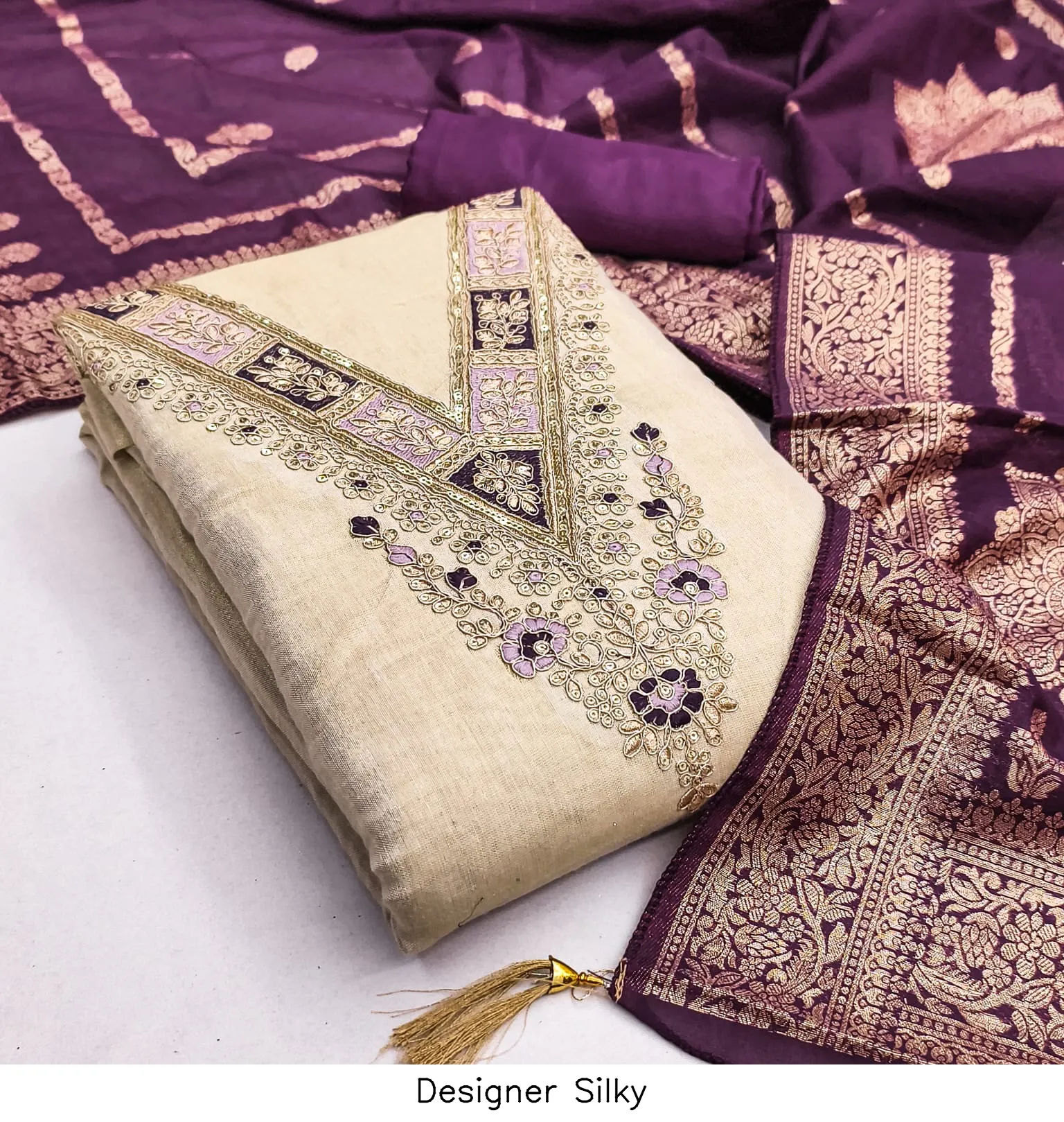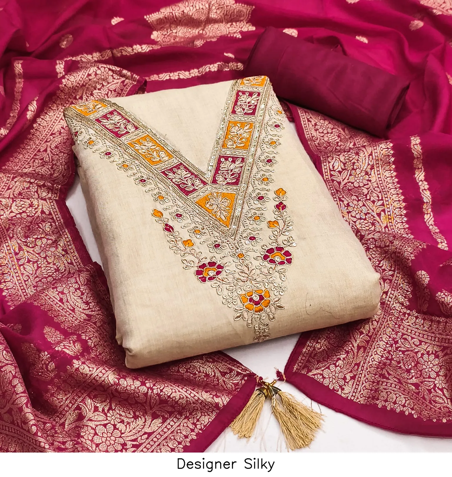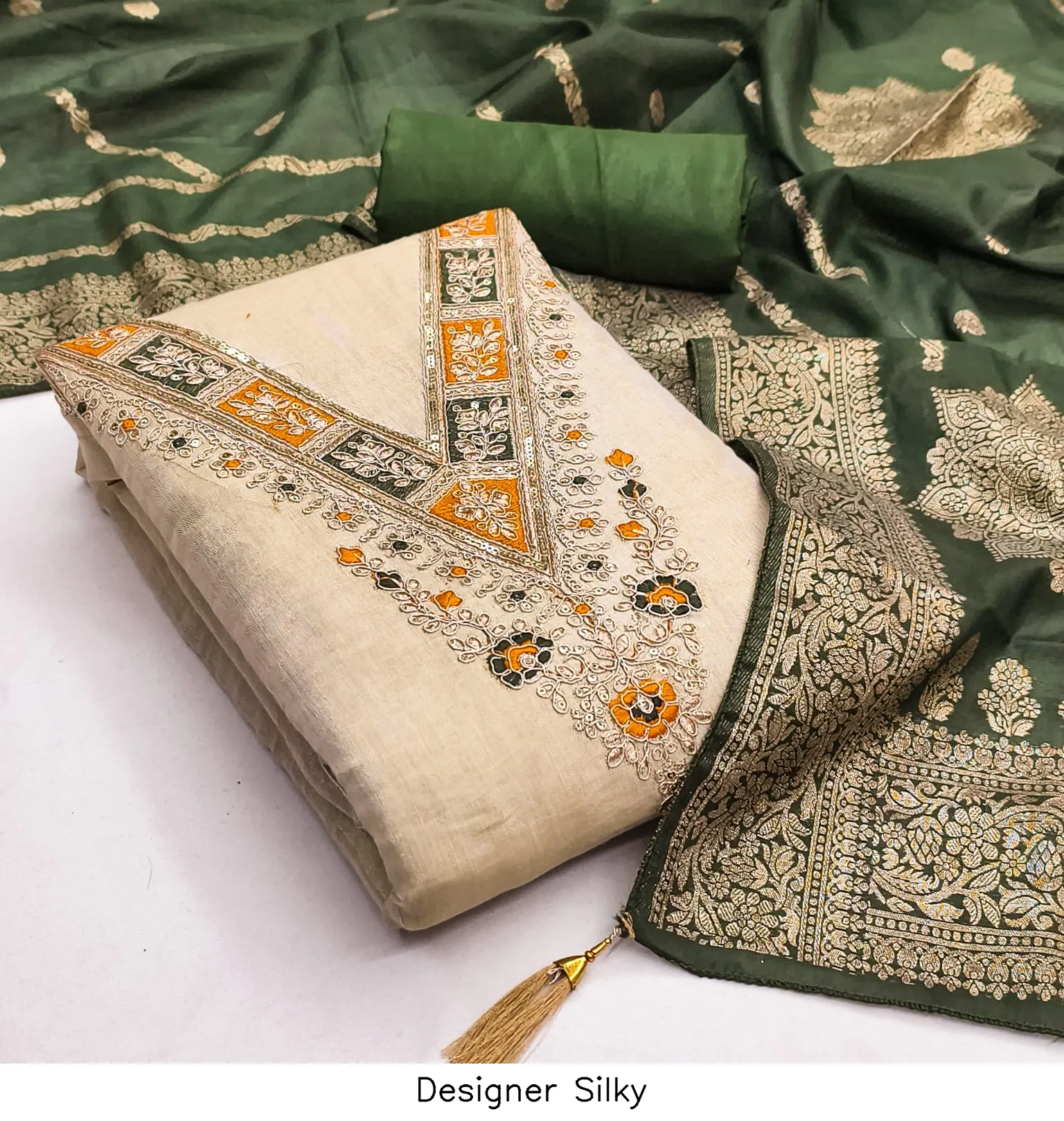 | Details | Top Fabric : Kosma Silk Kodding Sequence Work Bottom : Inner : Santoon Dupatta : Chanderi Silk Zakard |