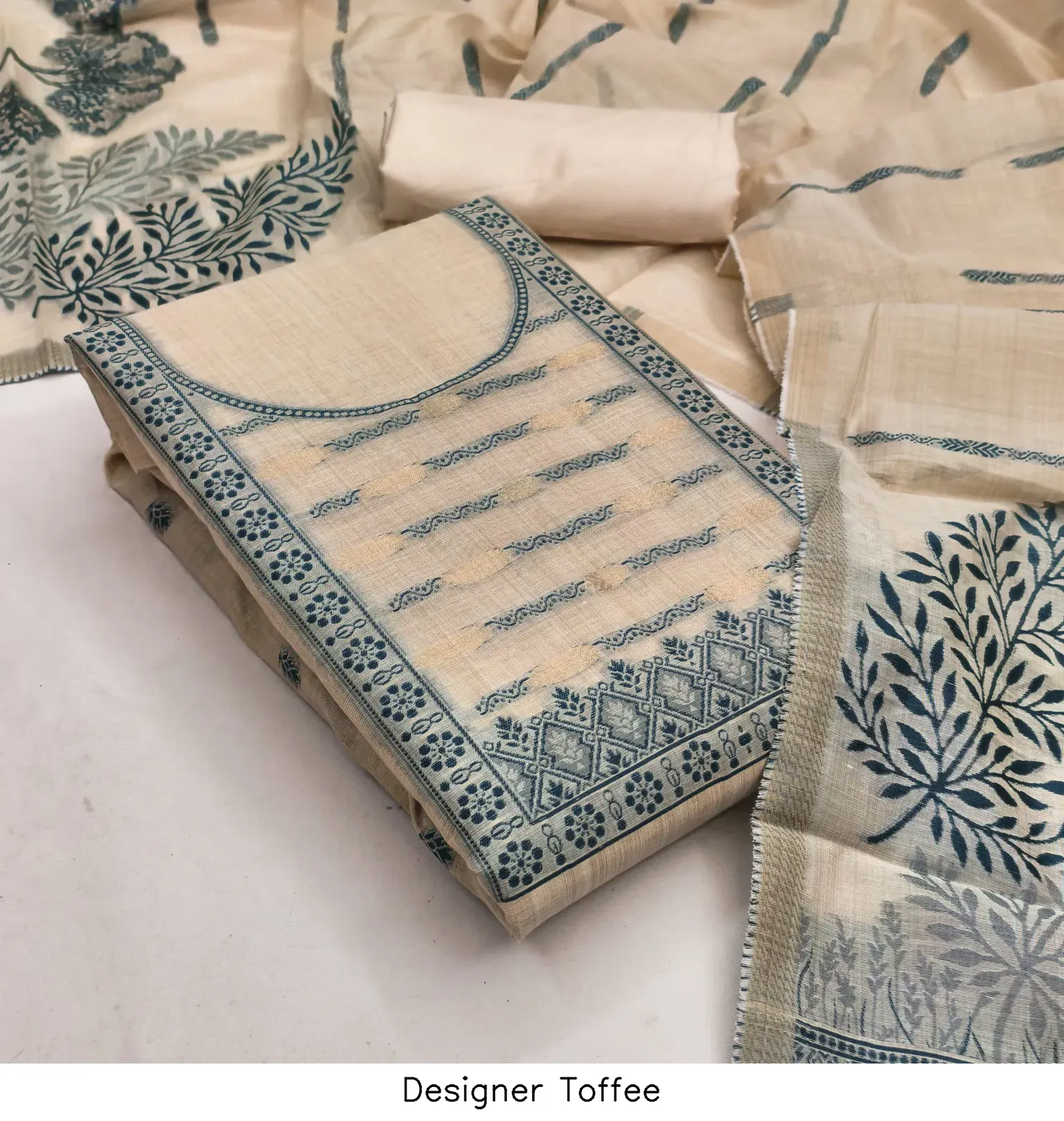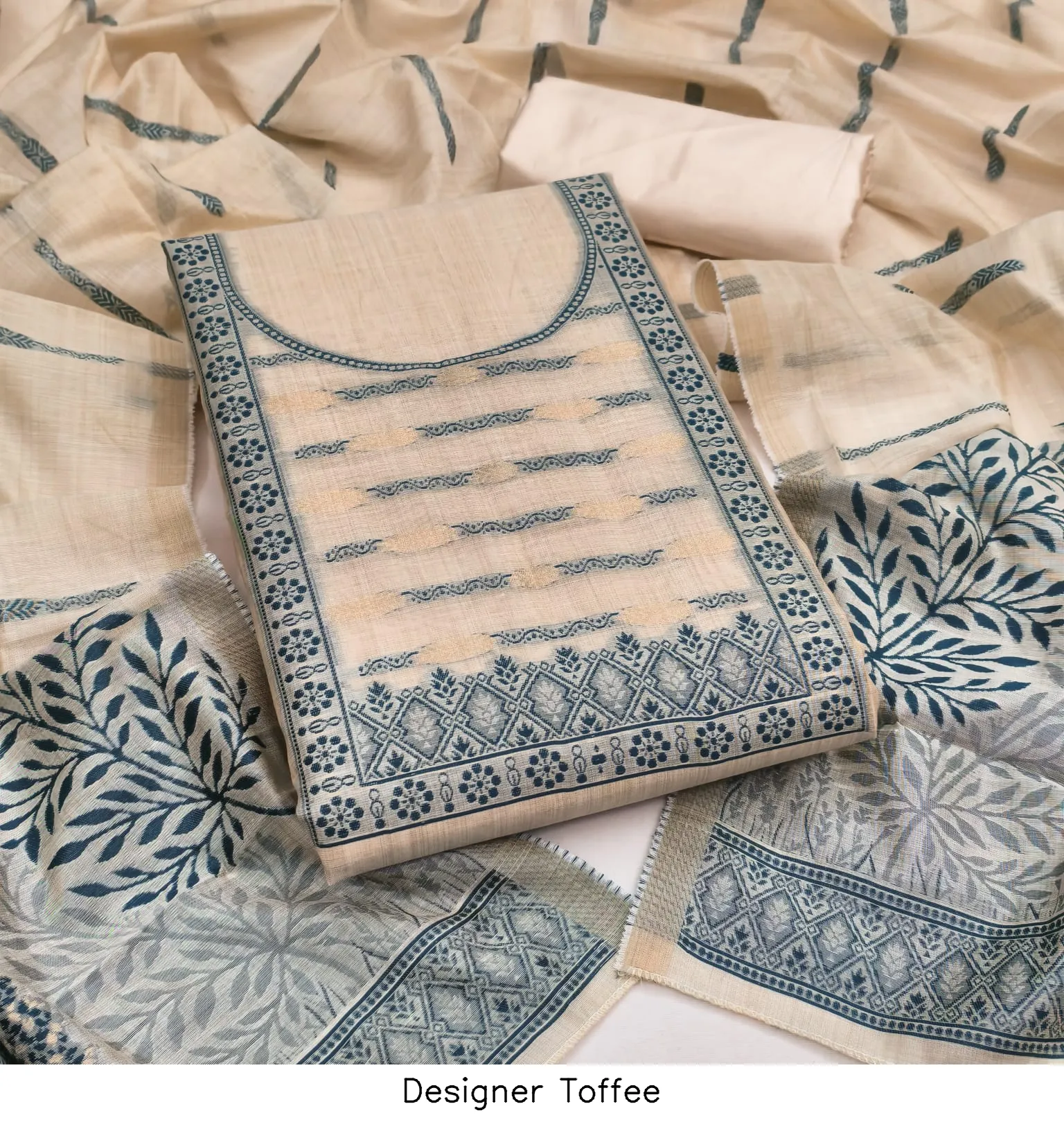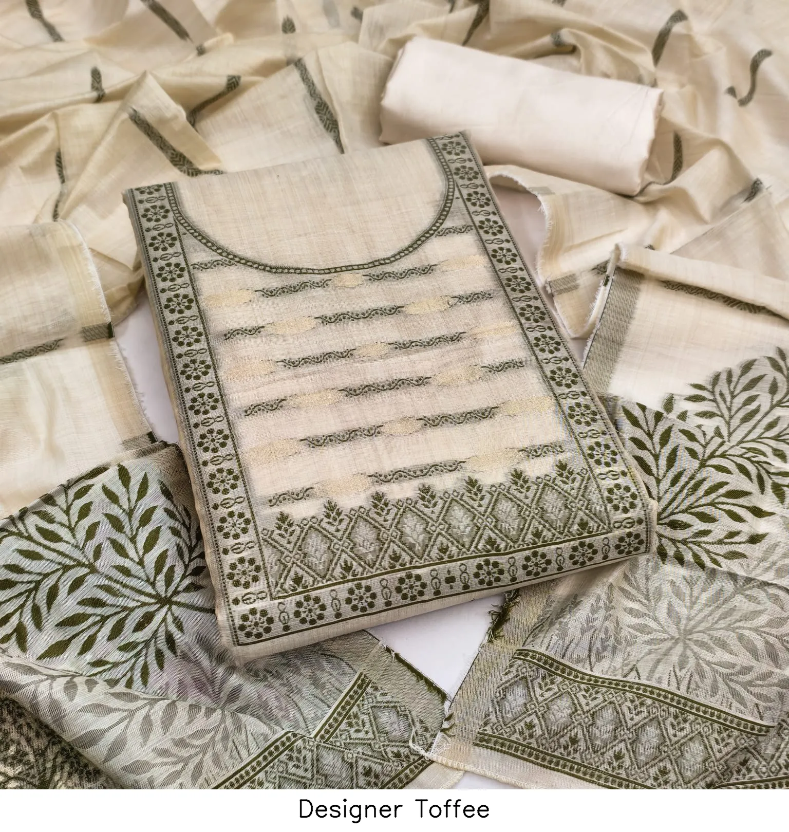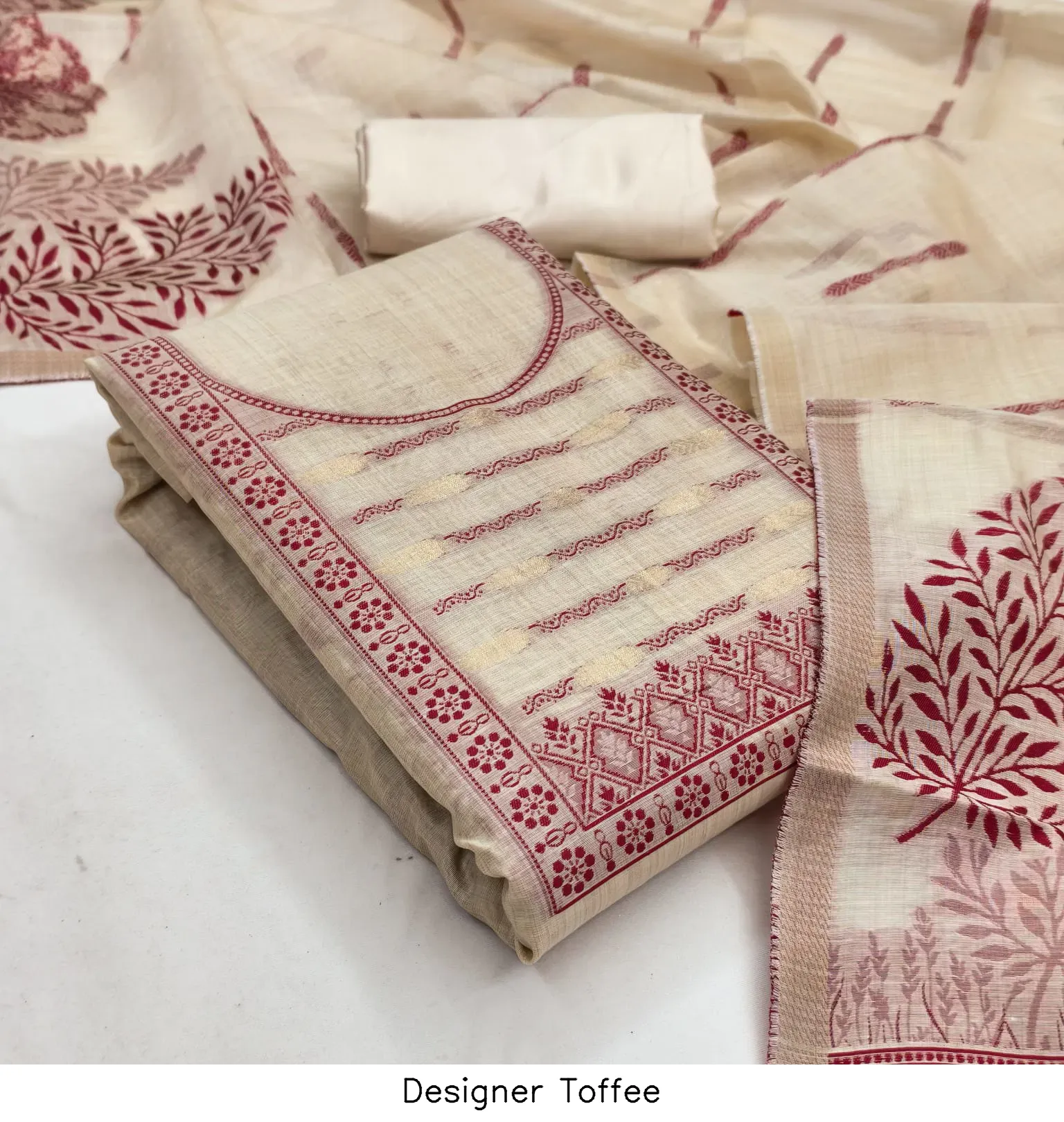| Details | Top : Semi Jamdani Weiving Fancy Jacquard Bottom : Inner : Santoon Dupatta : Semi Jamdani Weiving Pallu Jaquard |