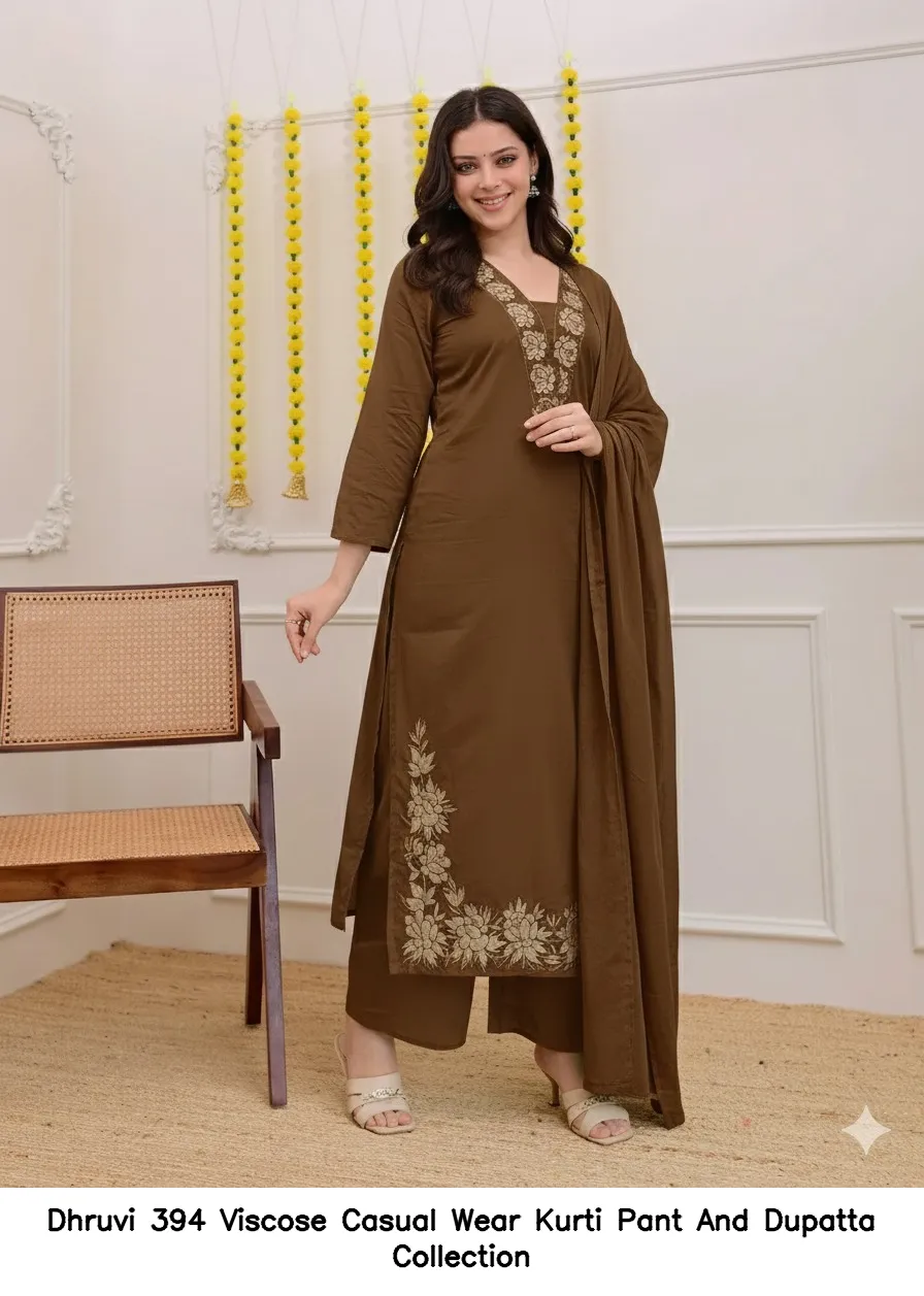 Dhruvi 394 Viscose Casual Wear Kurti Pant And Dupatta Collection