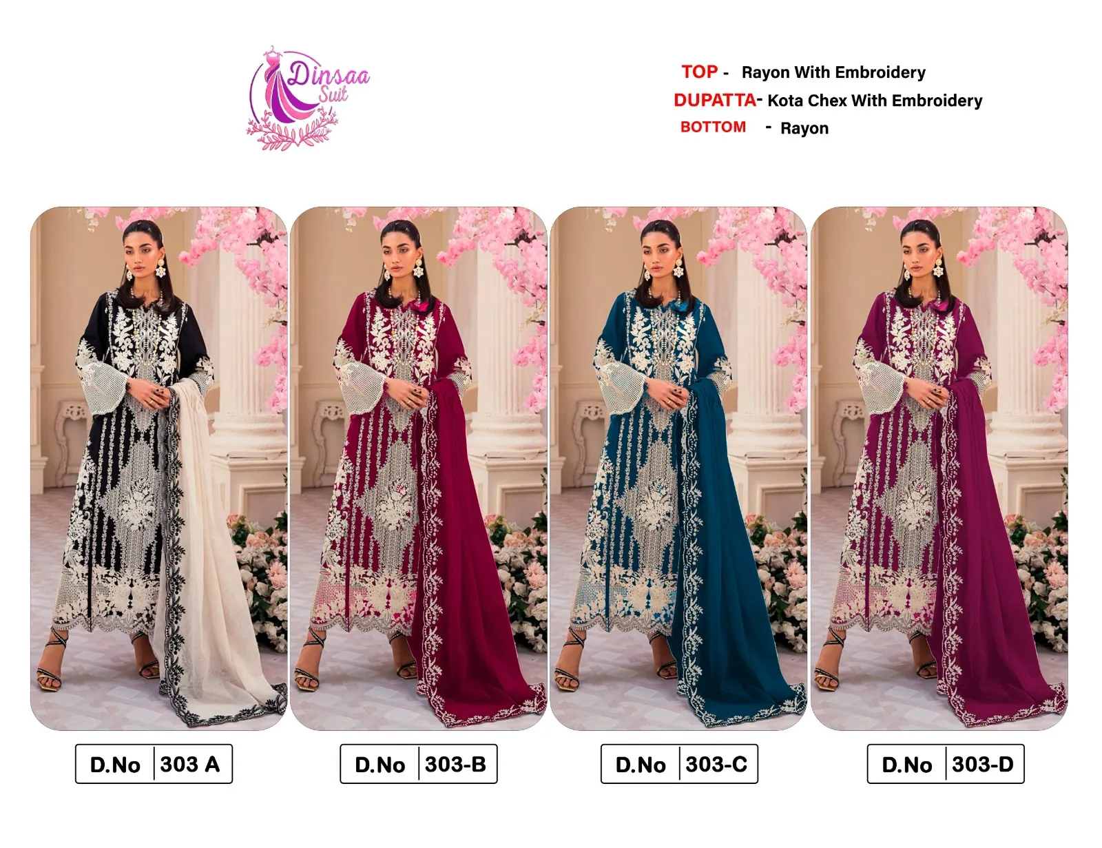 Dinsaa 303 A To D Embroidered Rayon Wholesale Pakistani Salwar Suit Collection