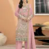 - Top: The top of this suit set is crafted from premium Heavy Georgette fabric, meticulously embroidered and adorned with heavy handwork. This intricate detailing adds a touch of opulence, making it an ideal choice for weddings, parties, or festive gatherings. The heavy handwork imparts a traditional charm that elevates the overall beauty of the outfit.