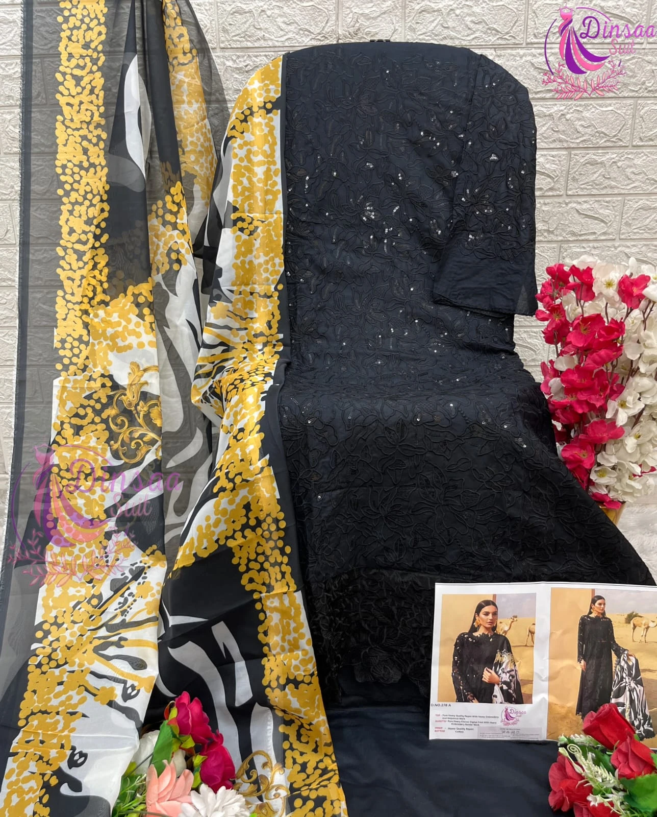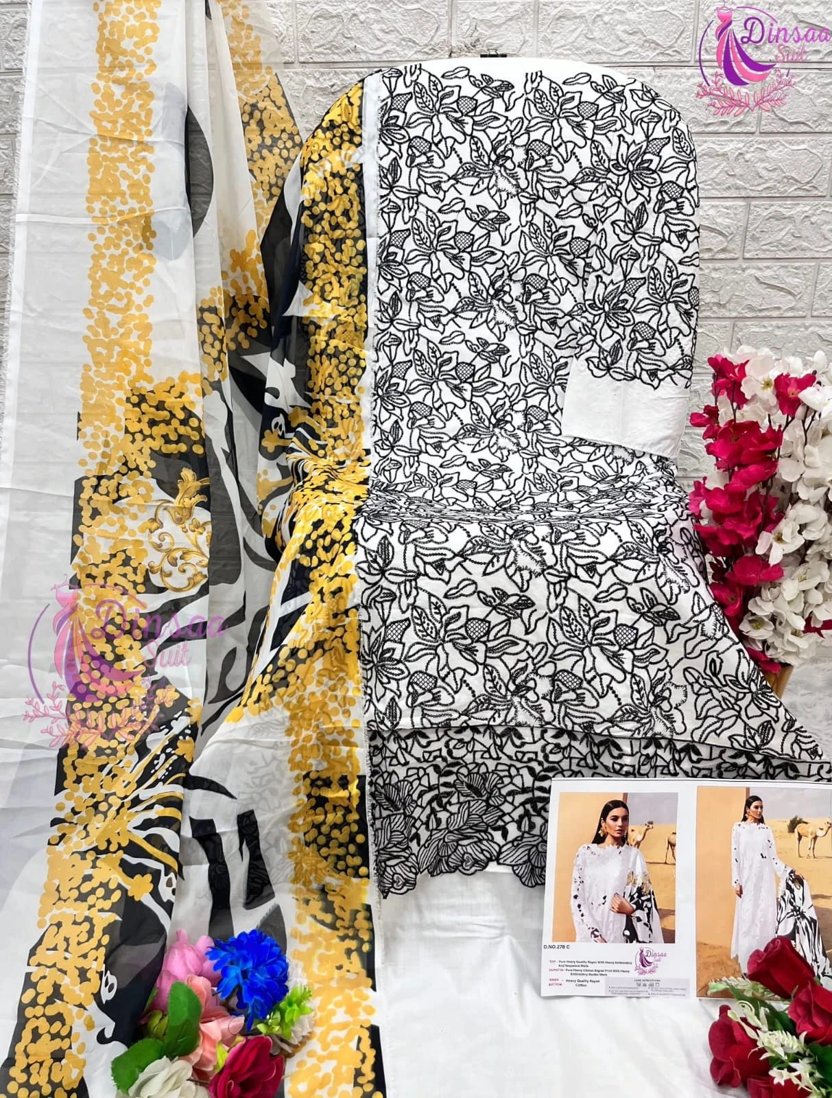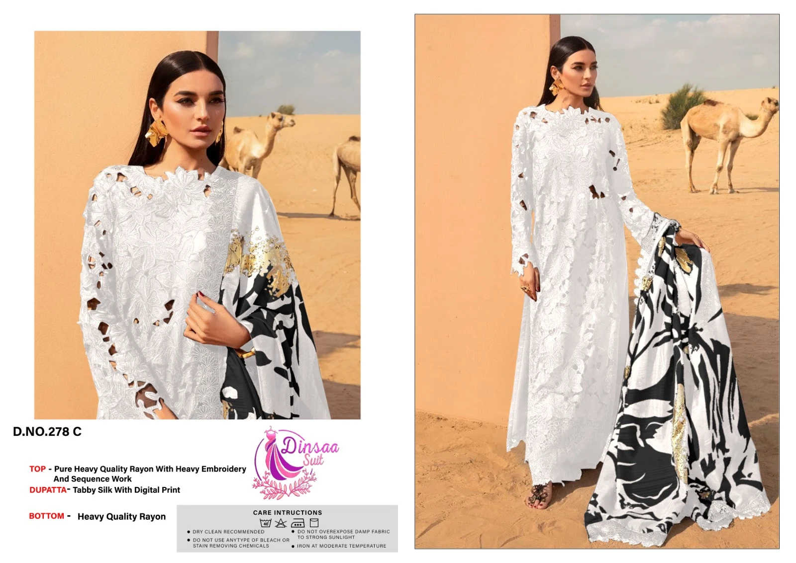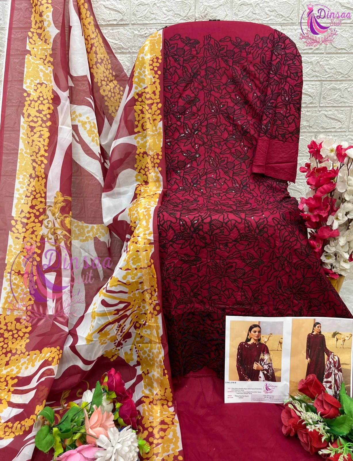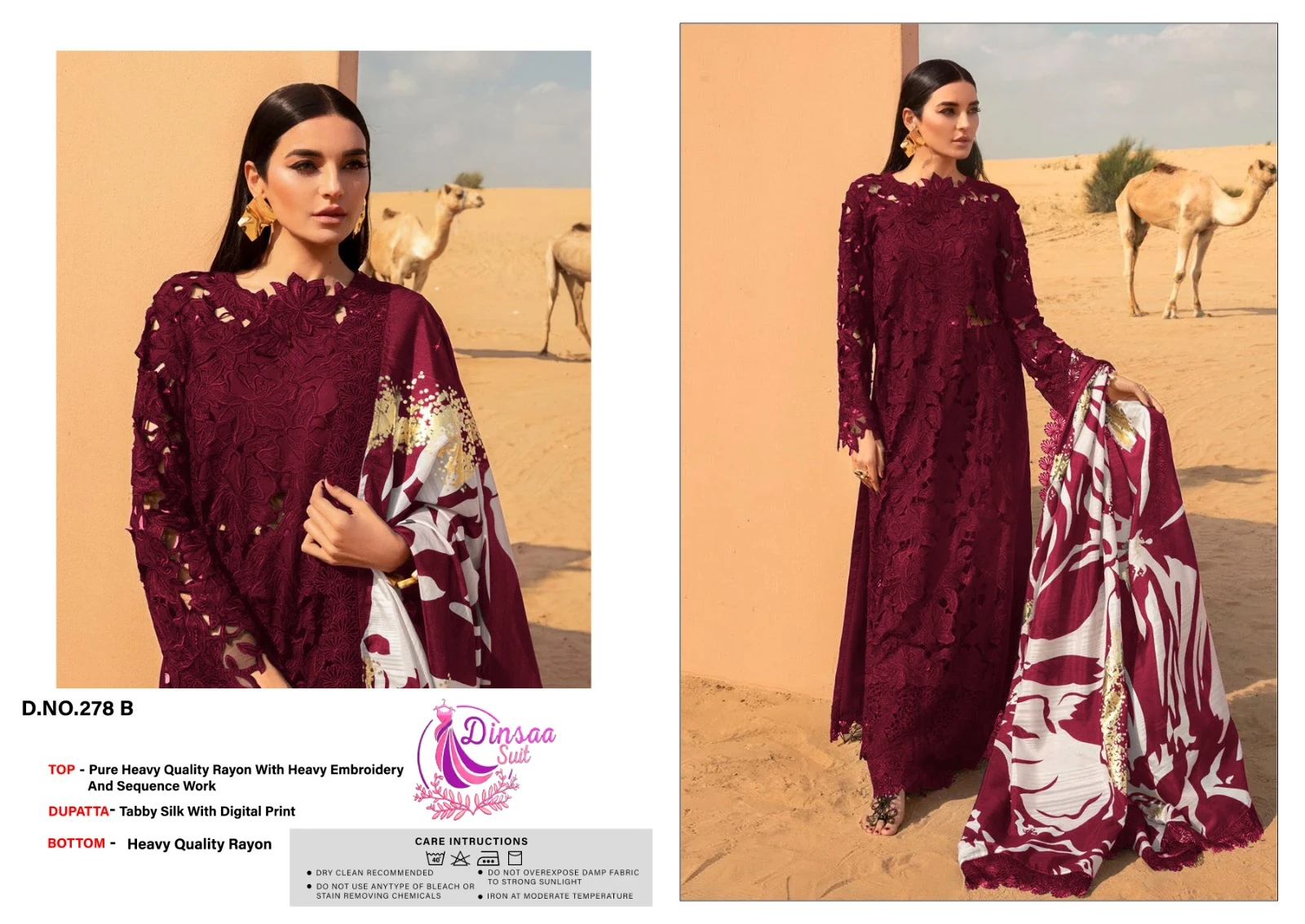 This set features a Heavy Rayon top with heavy self embroidery, paired with Heavy Rayon bottoms and a Tabby Silk printed dupatta. Each piece is priced at ₹1150 and is available for individual selection in 3 different colors.