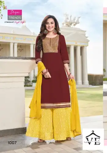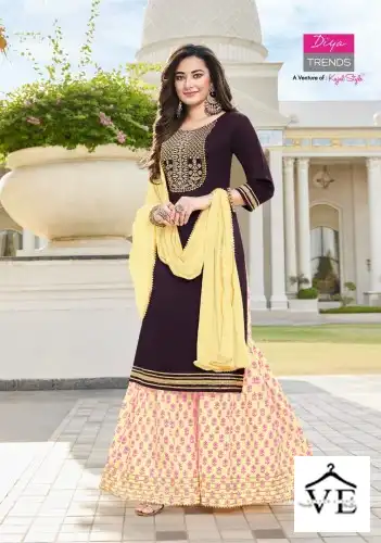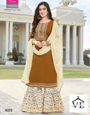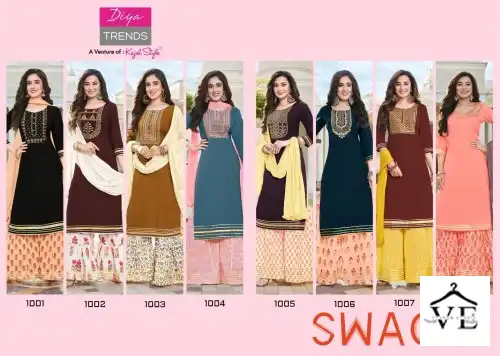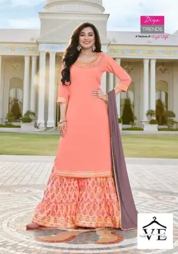 Diya Trends Swag Vol-1 Rayon Wholesale Sharara Salwar Suit Catalog of 8 Pcs. We deal in Kurtis, Sarees, Dresses Materials, Leggings, and Designer Salwar Kameez.