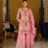 - The beautifully designed georgette top features delicate fancy embellishments, perfectly paired with a stylish georgette sharara, offering a trendy yet traditional silhouette. Completing the ensemble is a matching georgette dupatta with work, making it ideal for festive evenings and grand celebrations.