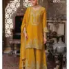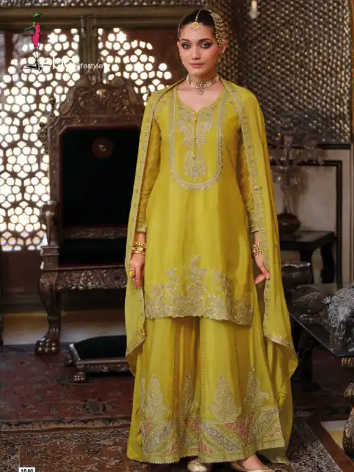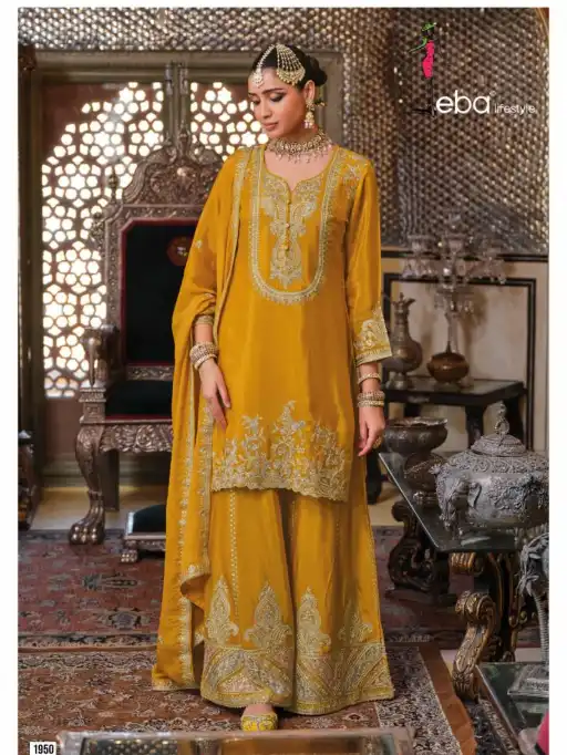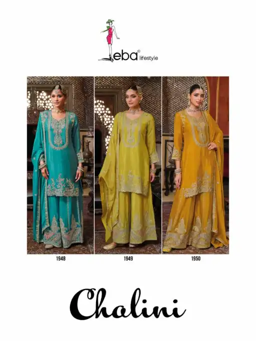 ✨ Elevate your festive collection with premium Chinon suits from Eba Chalini, featuring intricate embroidery on top, bottom, and dupatta in a luxe silhouette.