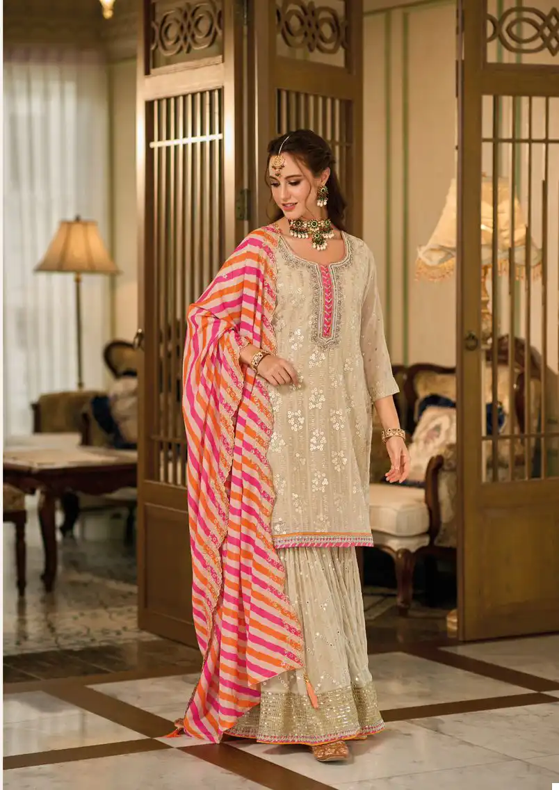- Dupatta: Complete your ensemble with our Faux Georgette dupatta featuring intricate embroidery work on the plazo front and back. The luxurious fabric drapes gracefully, while the delicate detailing adds a touch of opulence and refinement to your look.