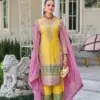 - Bottom: Complete your look with the matching Heavy Chinon bottom, featuring embroidery work on both the front and back. The cohesive design creates a harmonious ensemble, offering a seamless and polished look that’s perfect for weddings, festivals, and formal events.