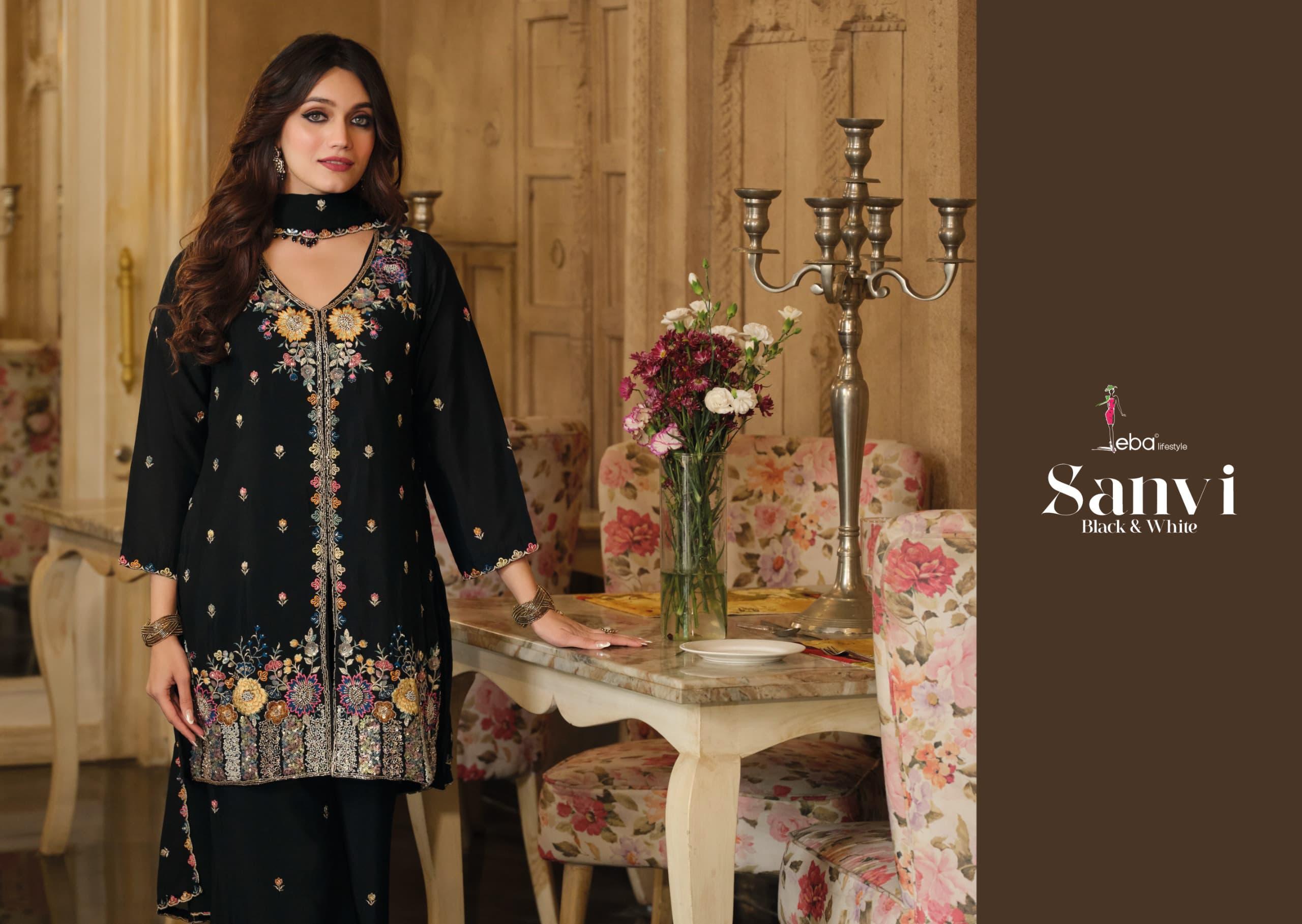 - Experience the charm of monochrome elegance with the Eba Sanvi Black and White Chinon Top Plazzo Dupatta Set, a graceful ensemble crafted for modern women who appreciate refined ethnic fashion. Designed by Eba LifeStyle, this collection blends classic color tones with intricate beats and embroidery work, making it an ideal choice for festive and ceremonial occasions.