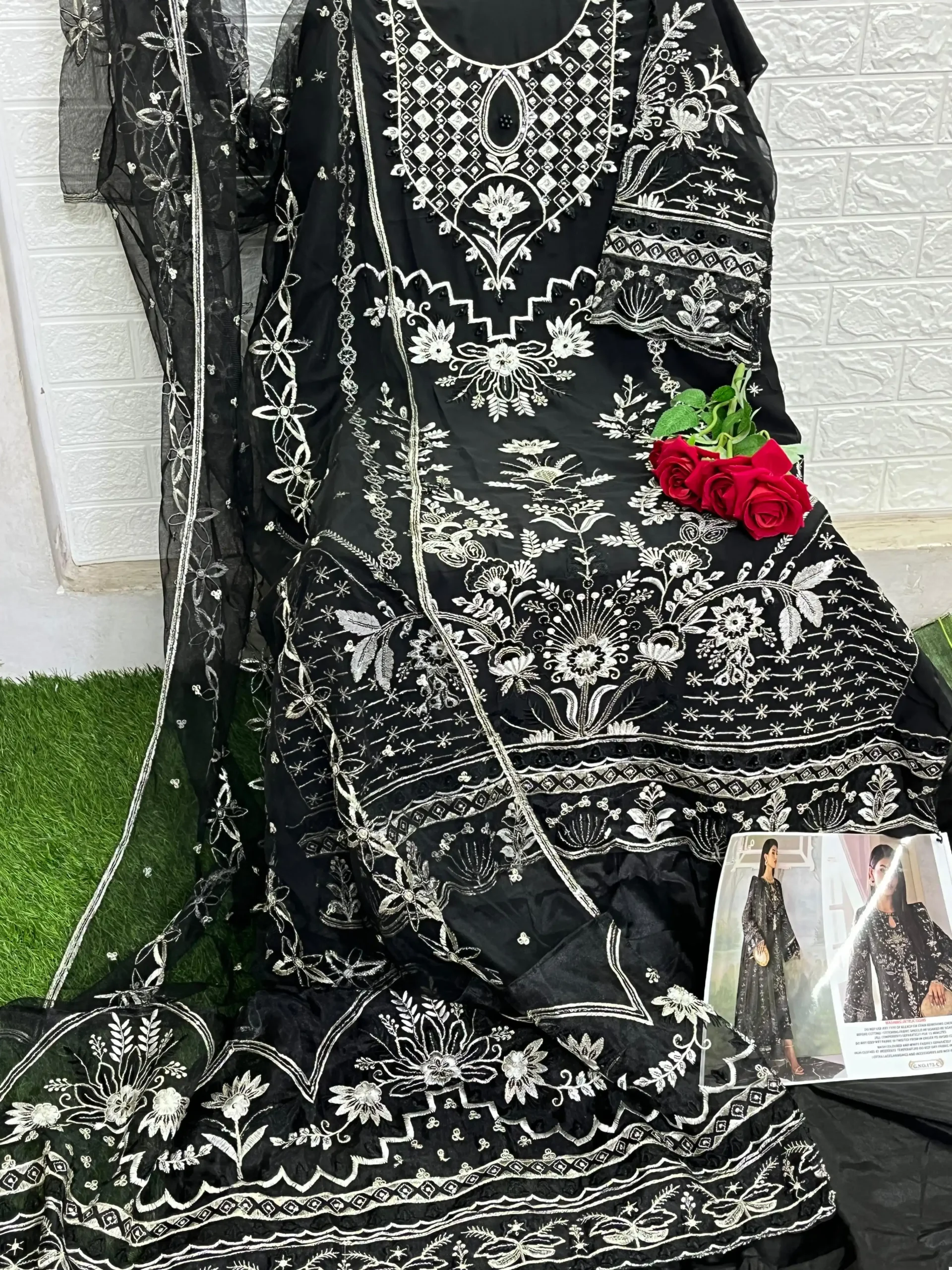 - Top: Made from heavy faux georgette, a type of fabric that mimics the feel and drape of georgette, embroidered with hand pearl work, which adds a decorative and luxurious element to the garment.
