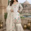 - The Anarkali is crafted from high-quality JMC silk and lined with soft micro cotton, ensuring all-day comfort while maintaining a luxurious drape. Intricate thread embroidery enhanced with sequins and rivet moti work adds a graceful sparkle to the outfit. The sharara comes fully stitched with a stretchable elastic waistband, offering ease of wear and a flattering silhouette. Completing the set is a matching dupatta adorned with 4-side embroidered borders, elevating the overall look.
