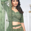 This graceful green mehendi bridal lehenga is crafted from premium soft net fabric, ensuring both comfort and elegance. The lehenga showcases intricate aari embroidery featuring floral and peacock motifs, further elevated by sparkling stone and zari embellishments. The kali cut design of the skirt, with scalloped borders and pillow-trim latkan, adds a regal touch. Accompanied by a matching unstitched blouse fabric and a net dupatta with embroidered borders, this lehenga exudes a perfect blend of tradition and modernity. Whether for a wedding, mehendi, or festive celebration, this lehenga is a showstopper.Explore more stunning designs in the Vardan Ethnic Lehenga Catalog and check out vidoes on our YouTube Channel.
