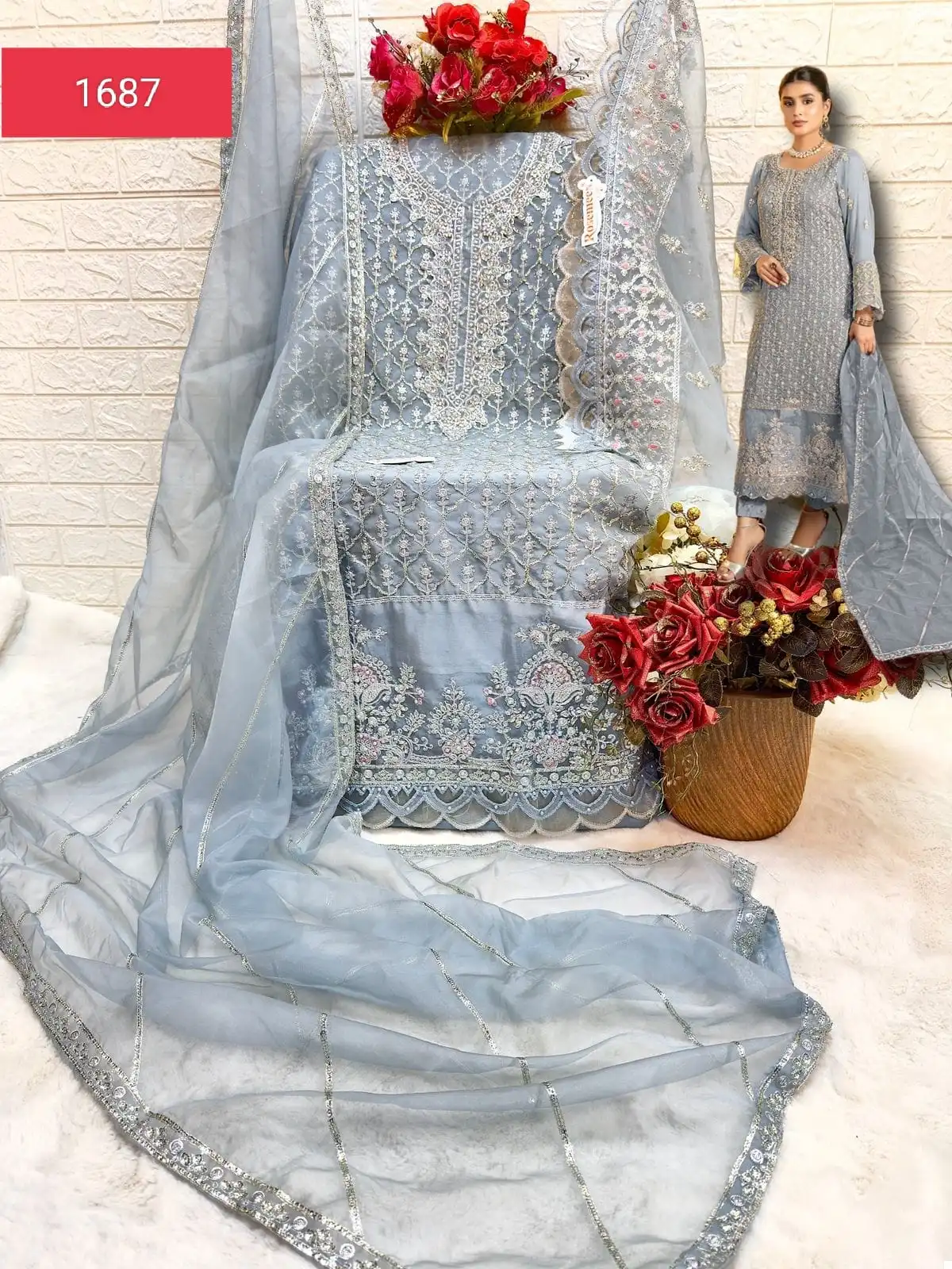 - Description: Organza Embroidered. The dupatta features embroidery work, complementing the design of the top.