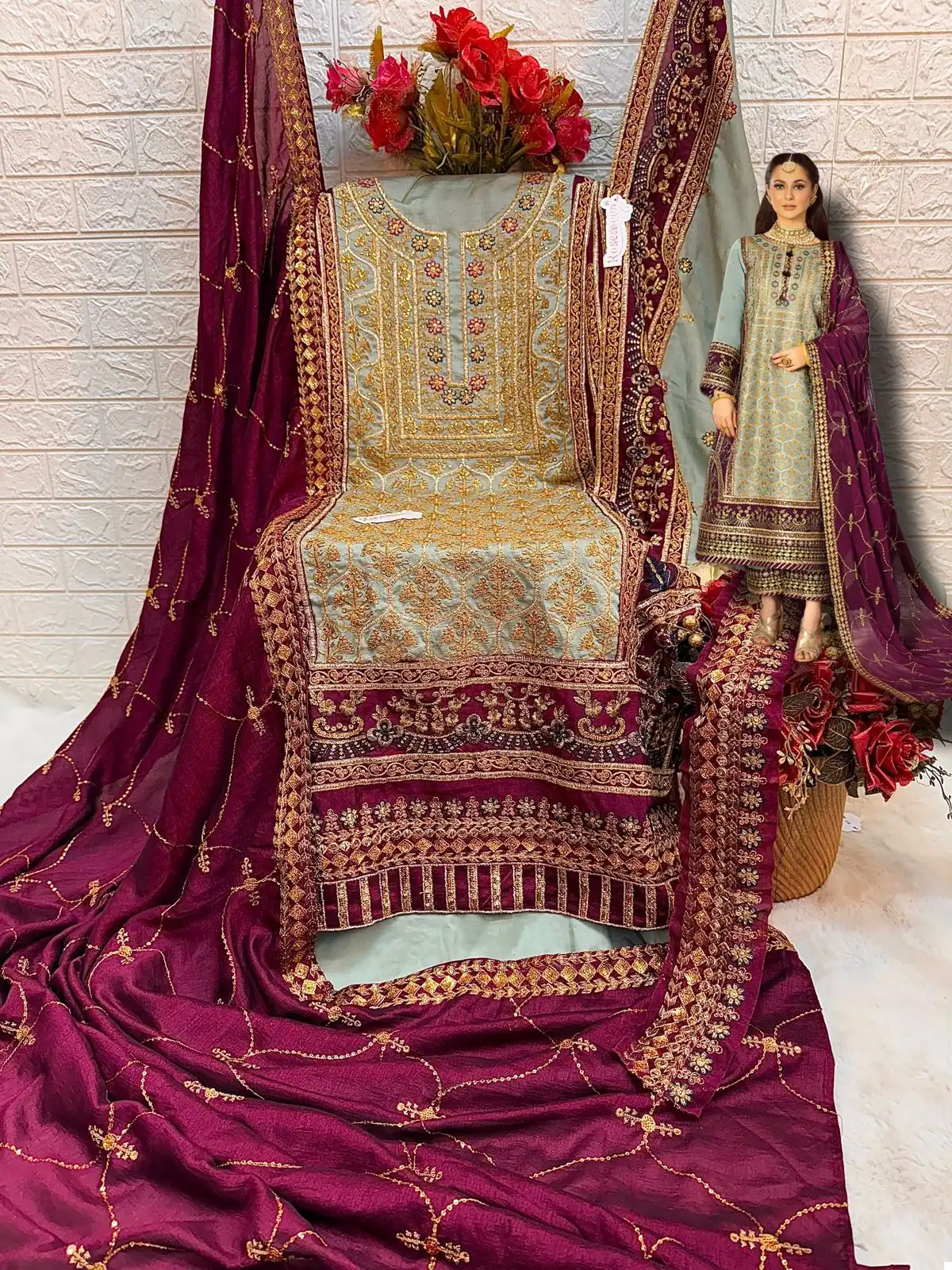 - Exquisite Chinon Embroidered Dupatta: The ensemble is completed with a Chinon dupatta, heavily embroidered to match the top. This dupatta not only enhances the outfit’s overall appeal but also adds a layer of sophistication, making it perfect for special occasions.