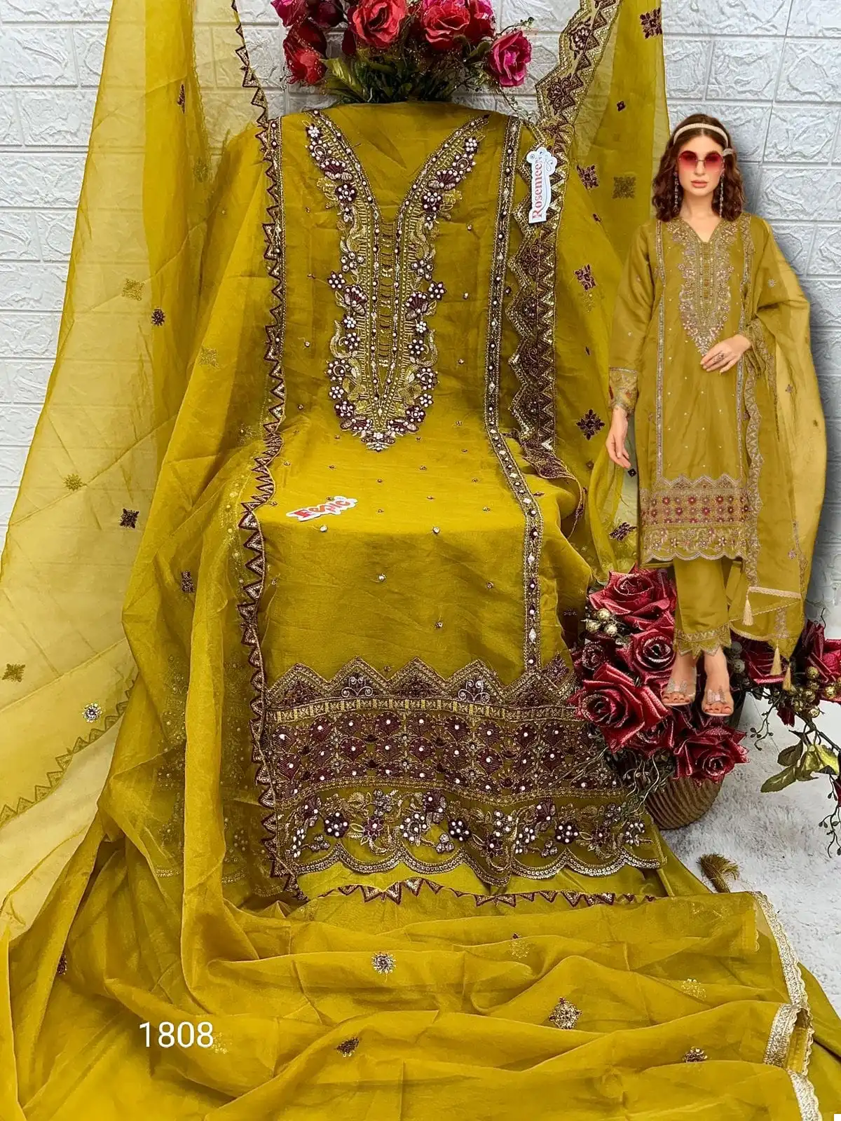 - Fabric: Organza embroidered. Similar to the top, the dupatta is made of organza fabric and features embroidery, adding continuity to the ensemble’s design.
