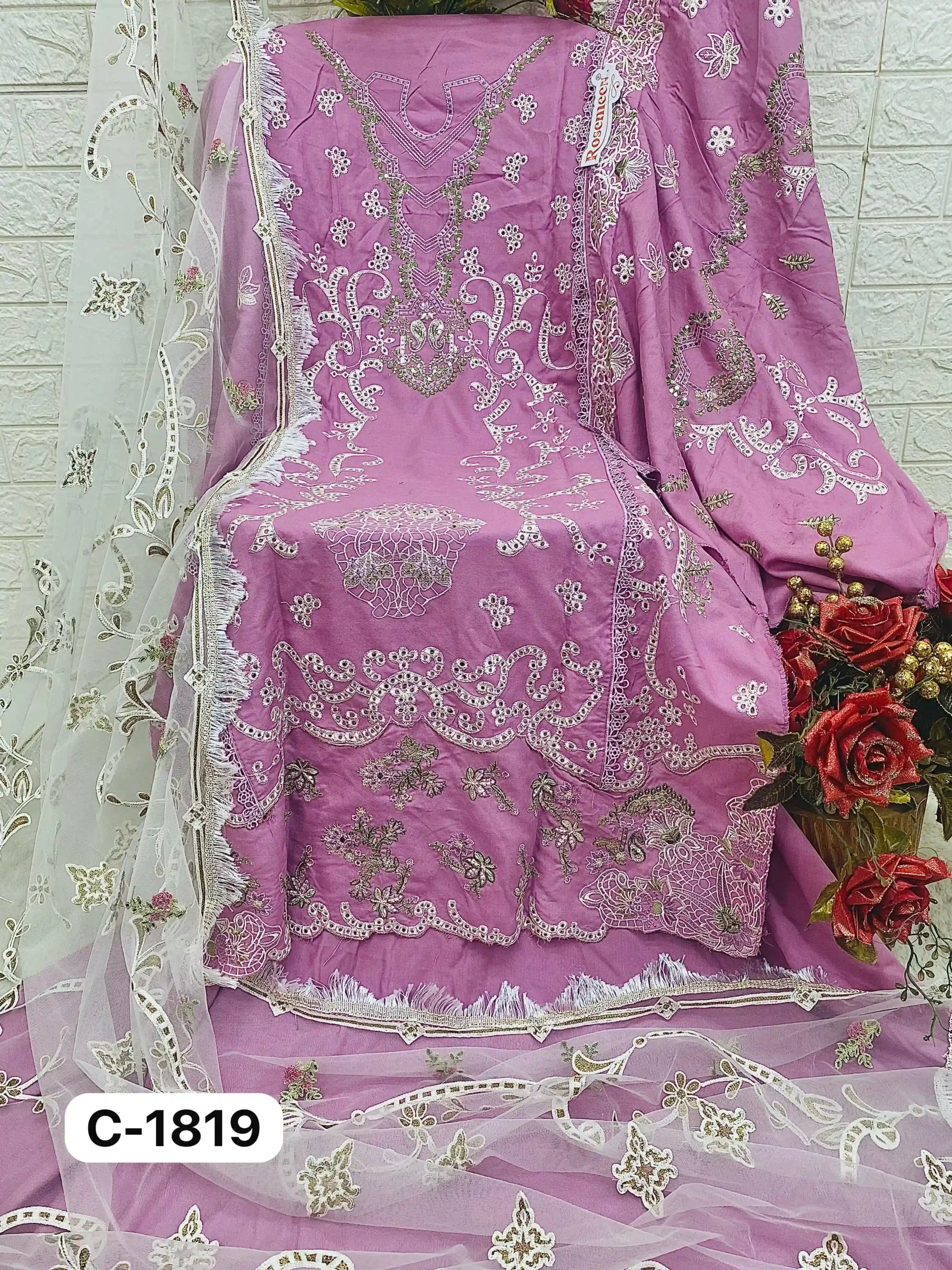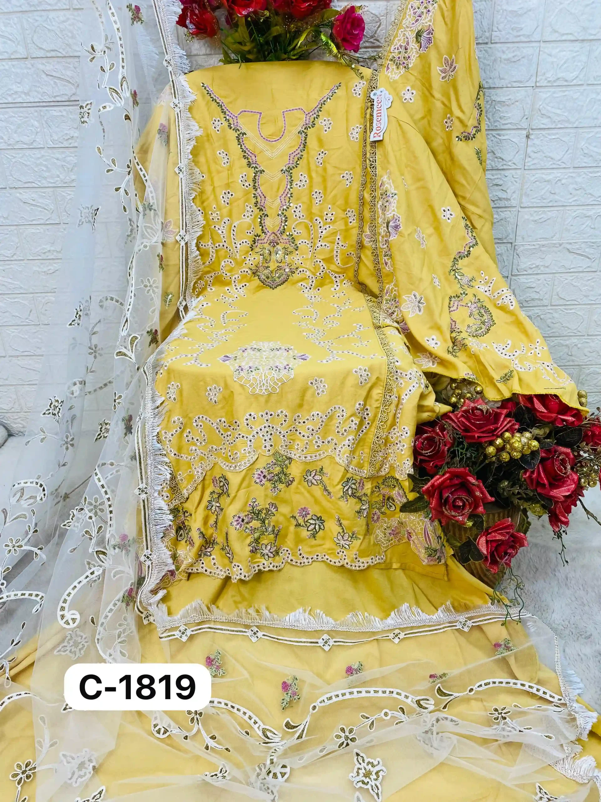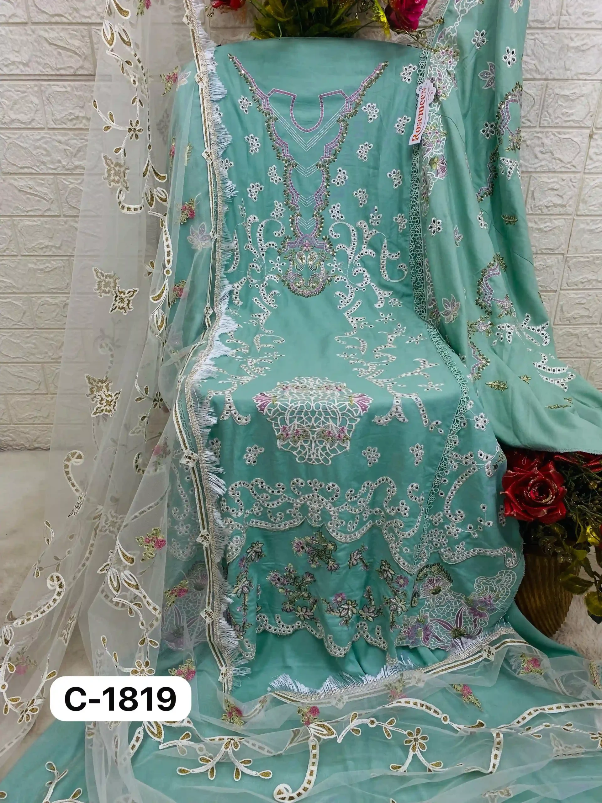 - Dupatta: The set is completed with a heavy embroidered net dupatta, adding a touch of opulence and enhancing the overall ensemble.