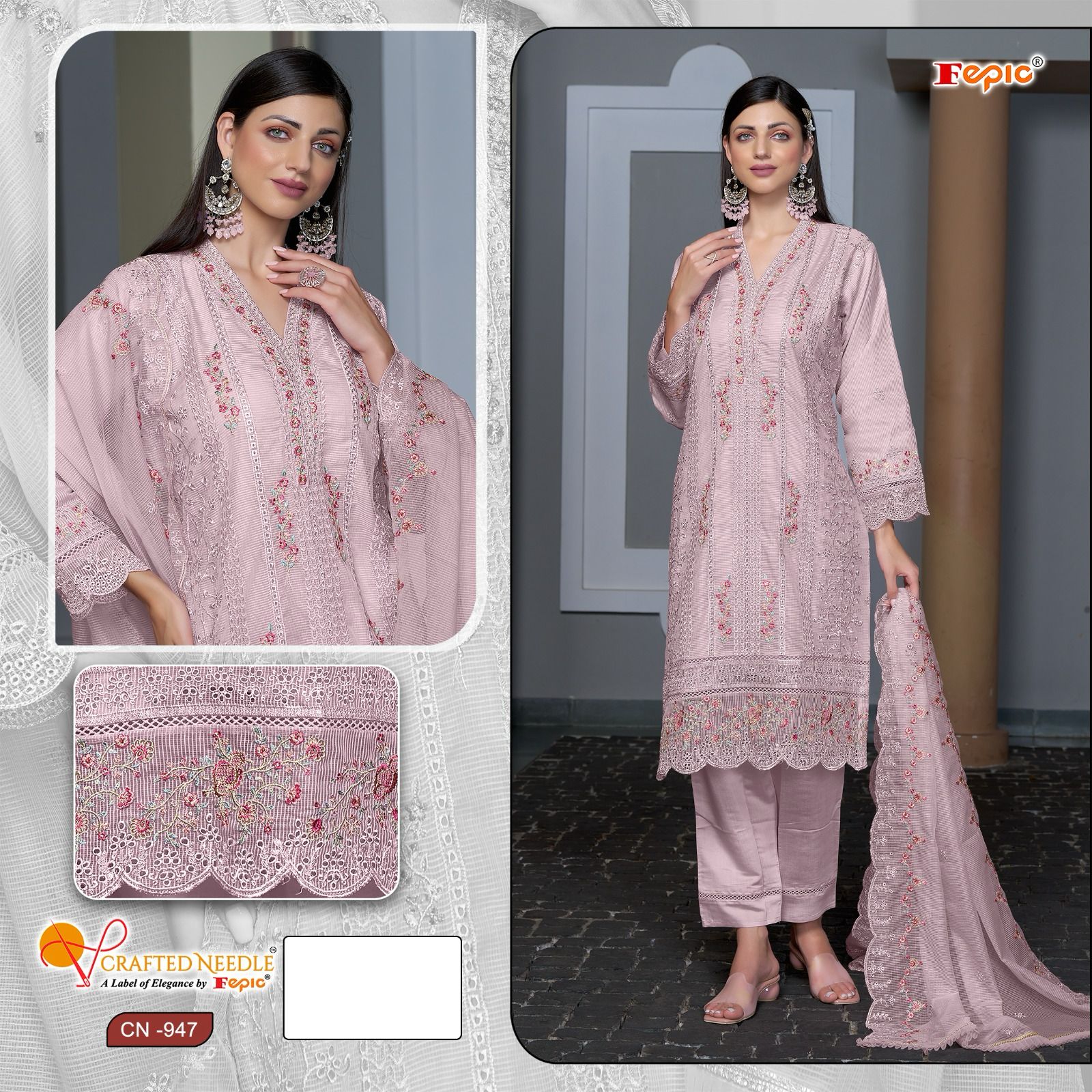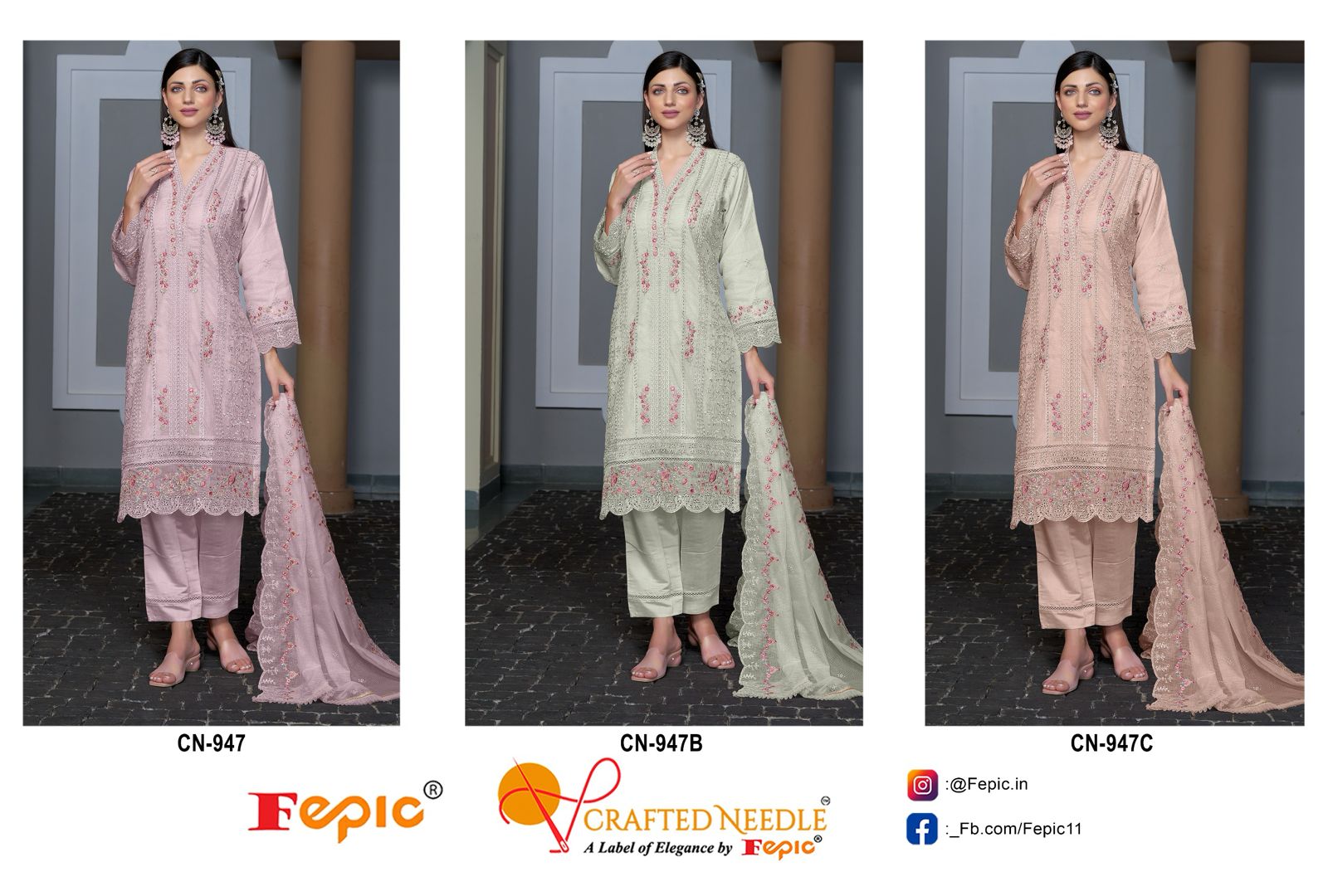 Introducing the latest Crafted Needle CN 947, an elegant creation by Fepic, designed to elevate your ethnic wardrobe. This suit set features Kota Chaques embroidery for a classic yet luxurious touch, paired with a comfortable viscose bottom. The matching Kota Chaques embroidered dupatta completes the look, offering a sophisticated ensemble for festive events, gatherings, and special occasions.
