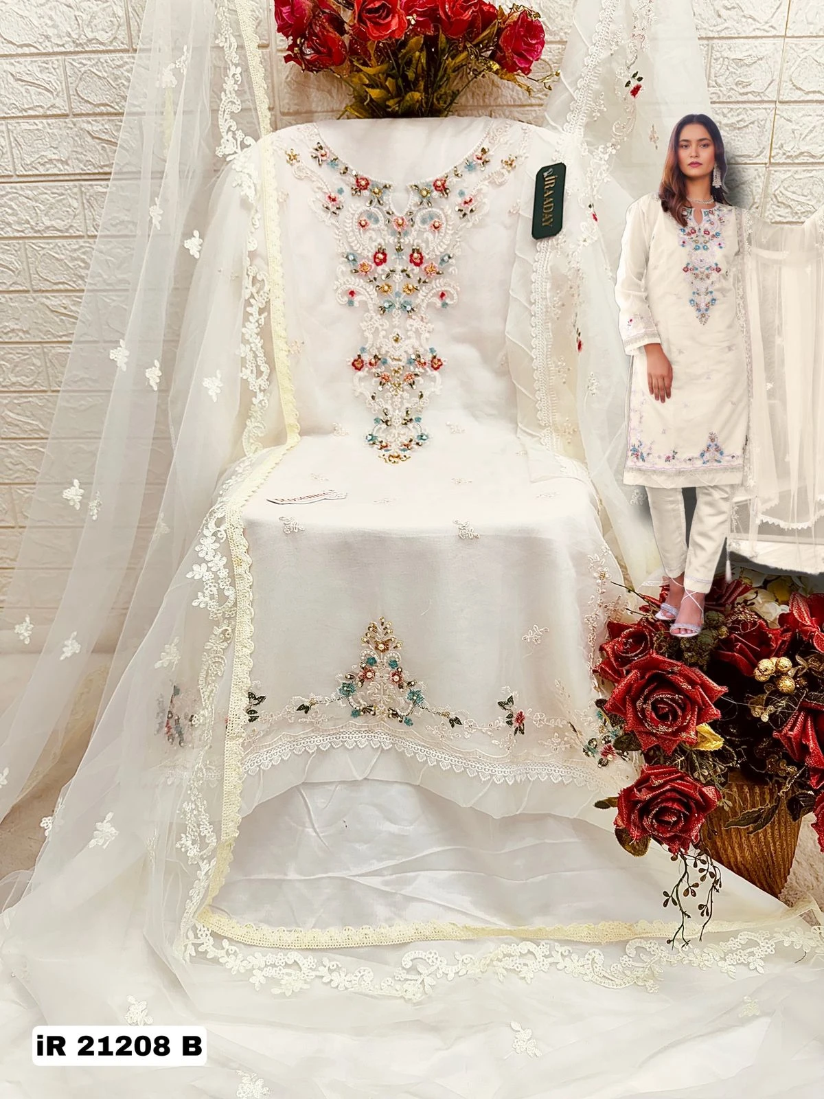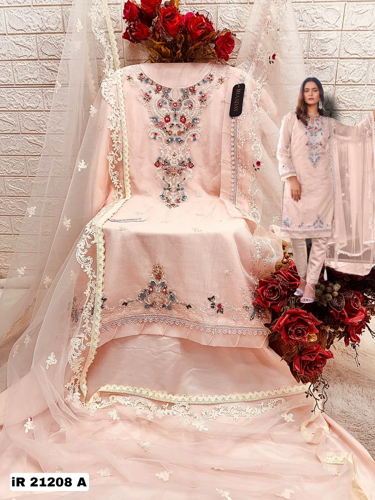 - The dupatta is made from delicate net fabric, which is light and airy. This material drapes beautifully and adds a touch of grace to the ensemble.