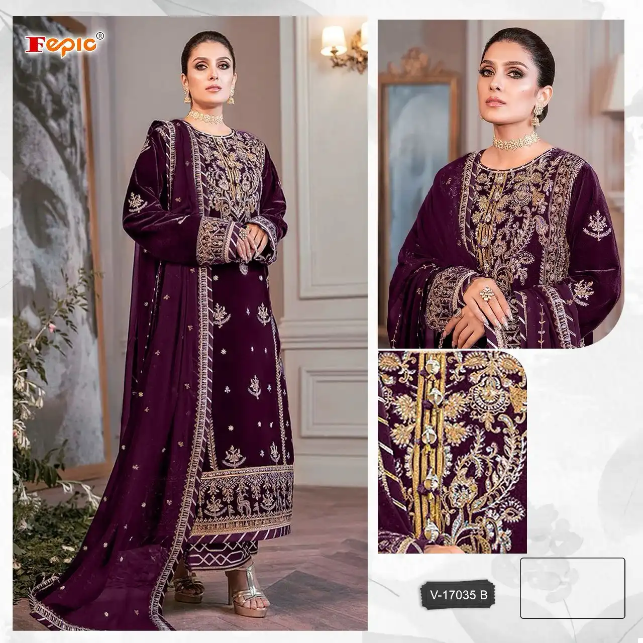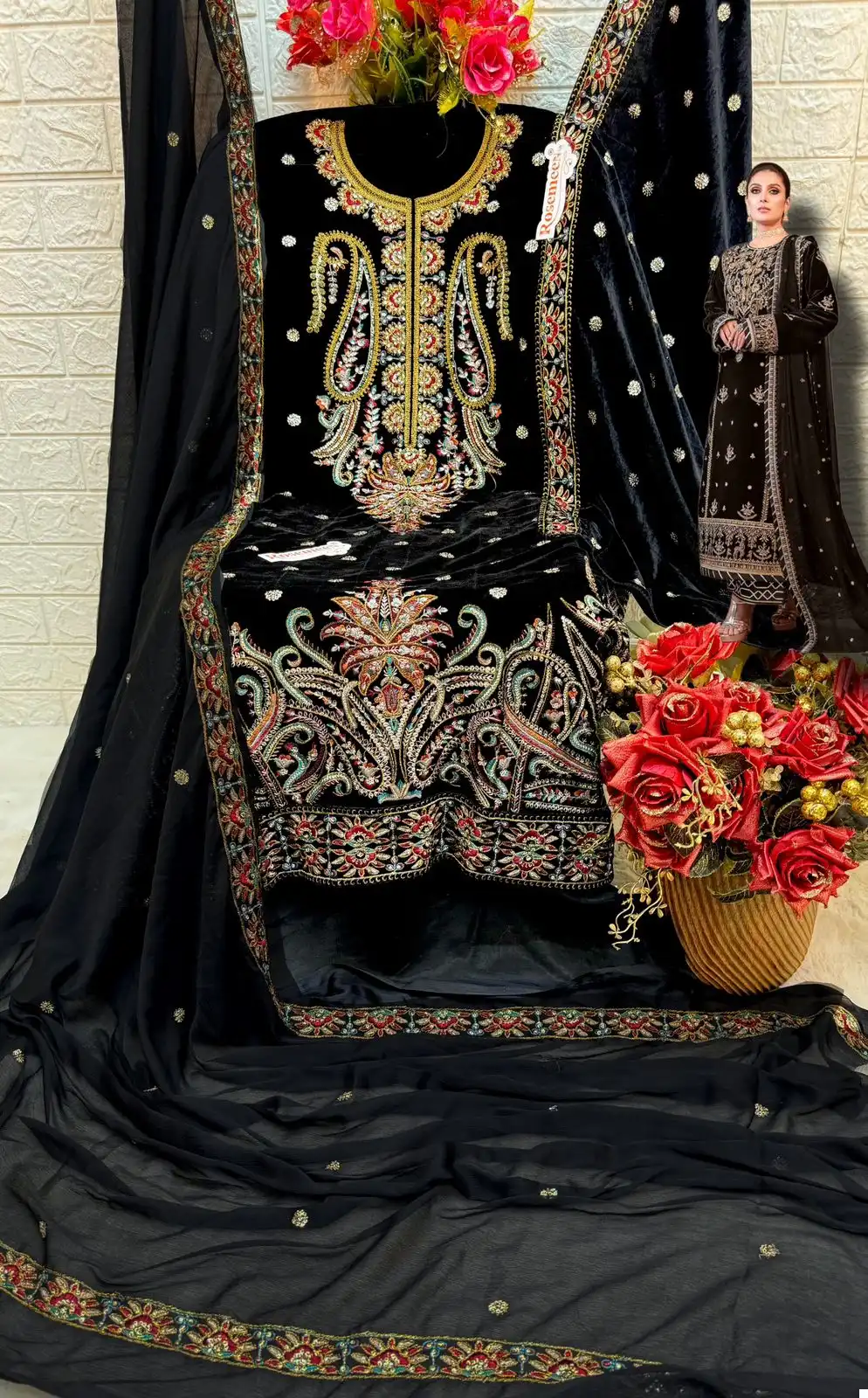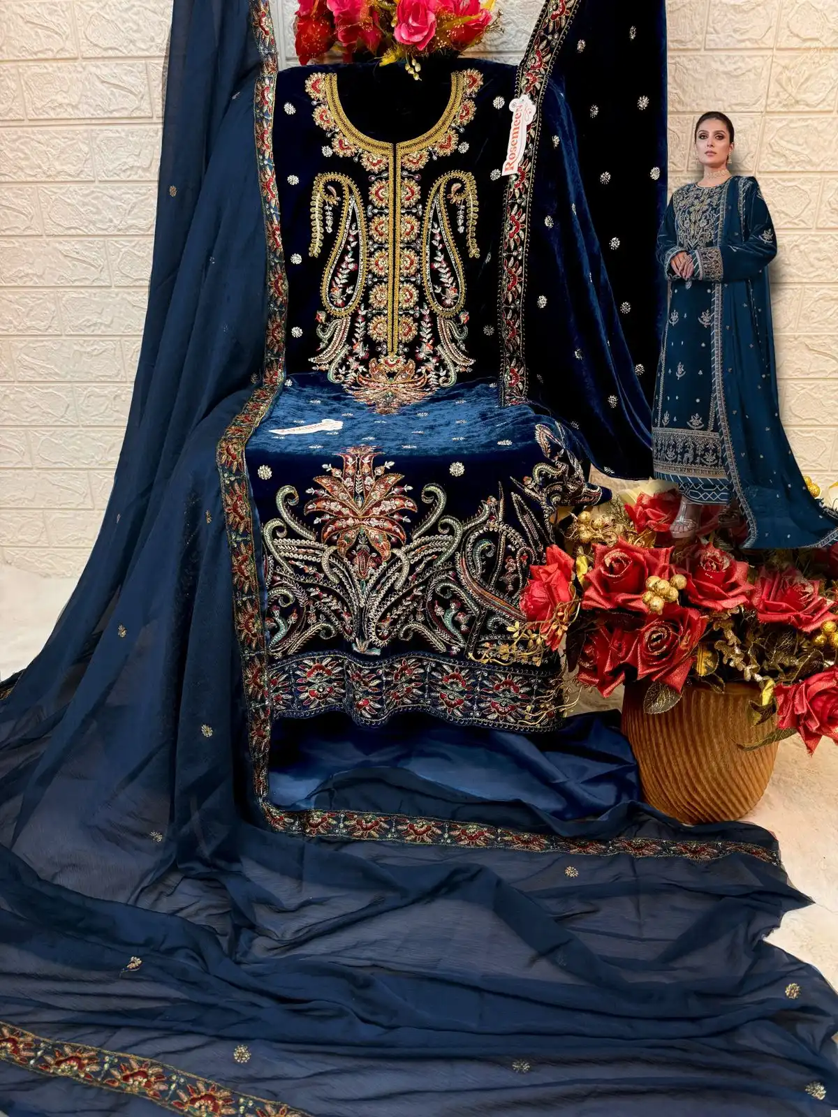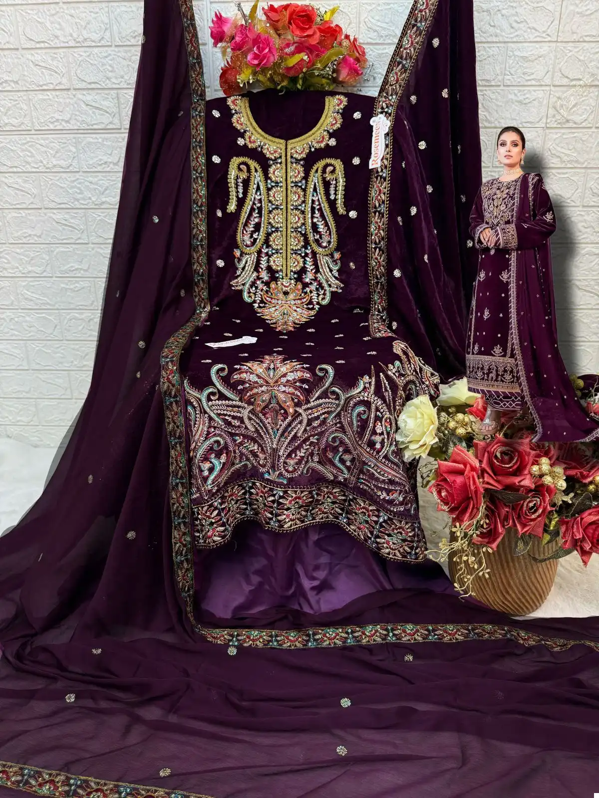 The combination of velvet and chinon with embroidery presents a set that is likely to be sought after for its opulent feel and versatile appeal, perfect for festivities, weddings, and other celebratory events.