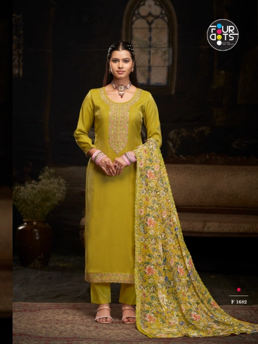Buy FOURDOTS Fabia premium designer suit sets with Leo Danting Simar fabric and digital print dupatta at the best wholesale price.