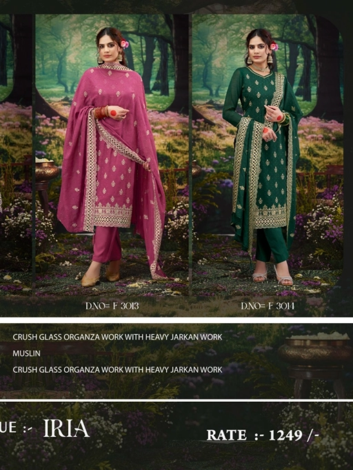 Step into elevated elegance with IRIA, a luxurious 4-design collection crafted in Crush Glass Organza and adorned with exquisite Heavy Jarkan Work – a true celebration of festive fashion.