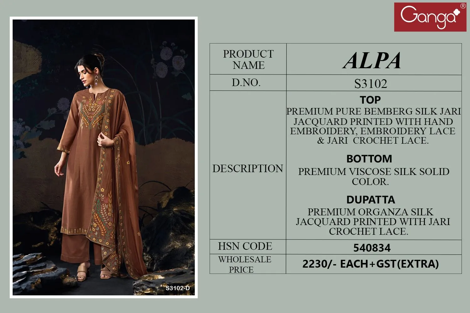 Ganga Alpa 3102 Premium Pure Bemberg Silk Jari Wholesale Fancy Salwar Suit Collection