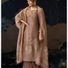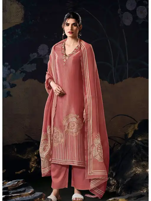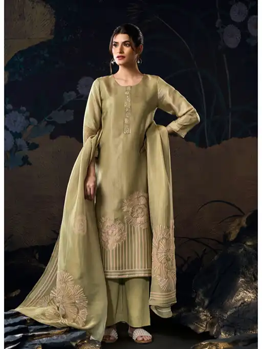Unveil elegance with Ganga’s Anwika 3130, a luxurious 3-piece designer suit set crafted in Premium Bemberg Gadwai Silk. This ensemble combines the richness of hand embroidery with heritage-inspired prints and fine crochet lacework, making it perfect for refined festive or occasion wear.