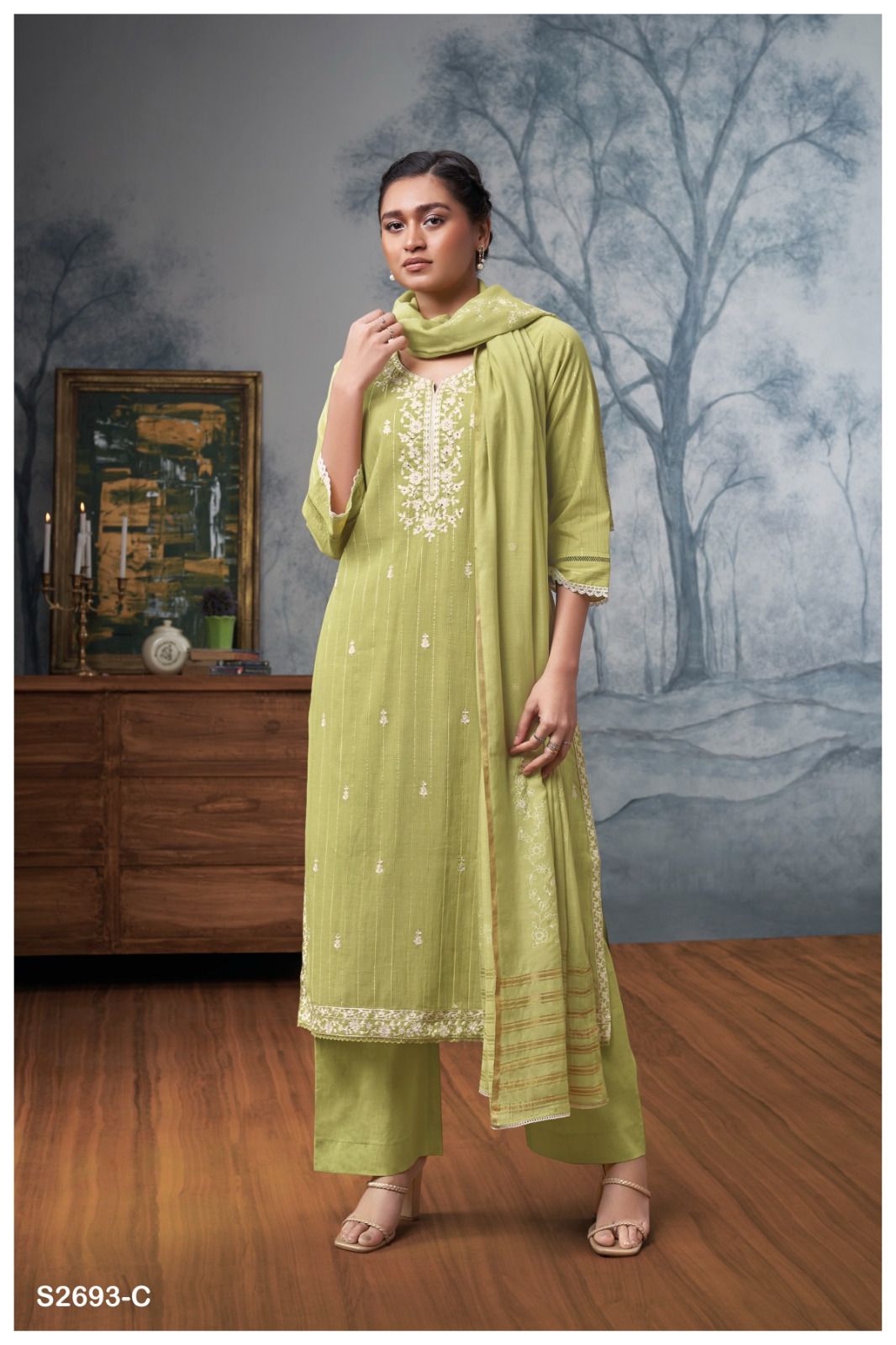 A luxurious blend of comfort and sophistication, Arika 2693 features premium cotton fabric with embroidery, lace detailing, and intricate handwork. The viscose silk foil khadi printed dupatta adds a regal touch.