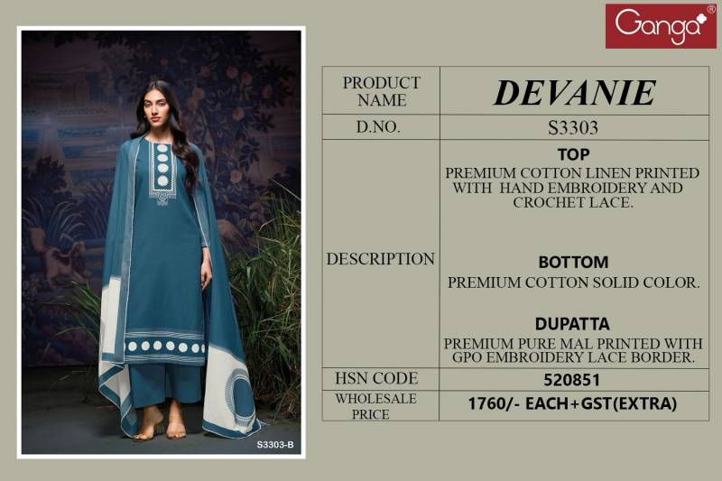 Ganga Devanie Cotton Linen Printed Embroidered Wholesale Salwar Suit Collection