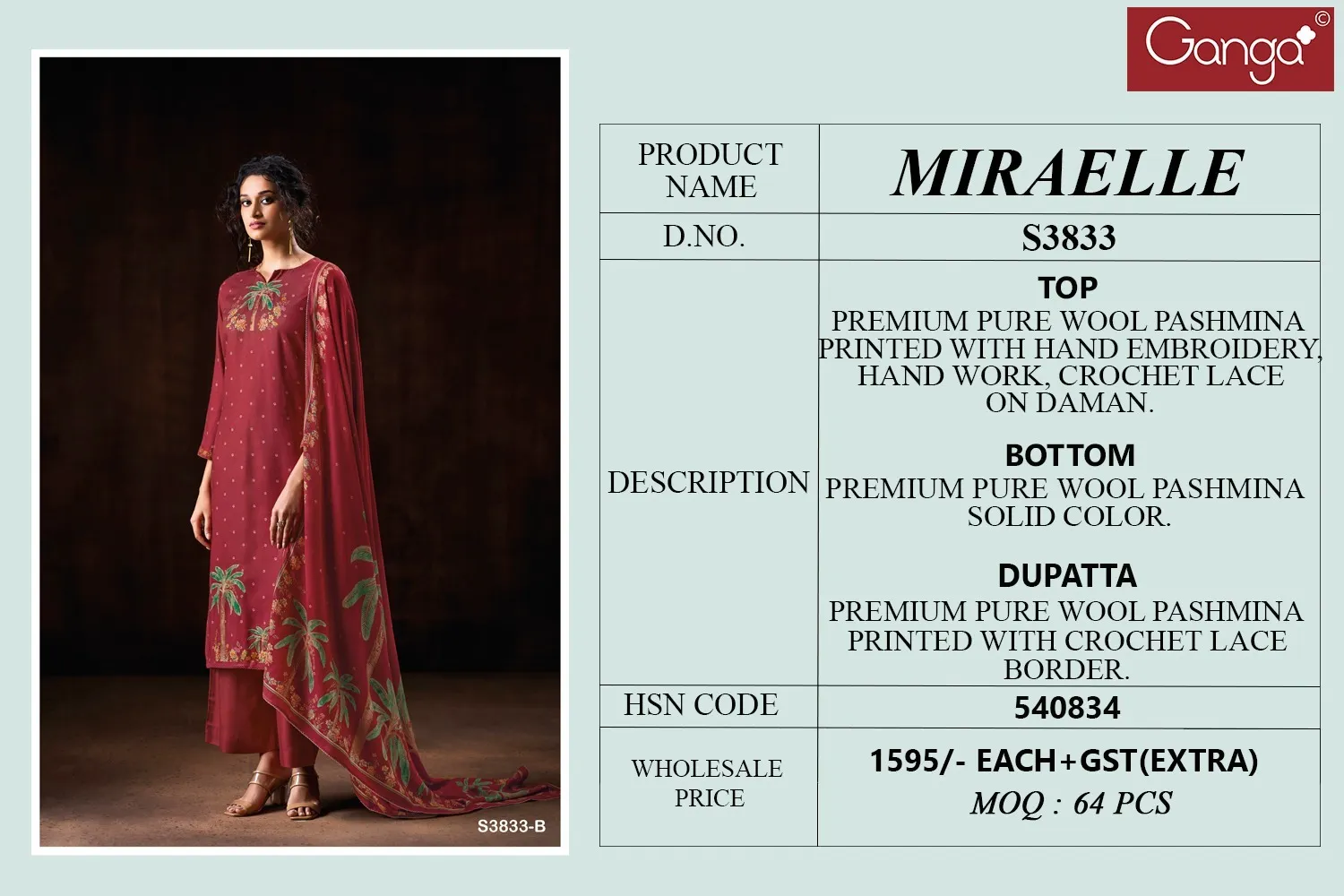Ganga Miraelle 3833 Pashmina Printed Handwork Suit