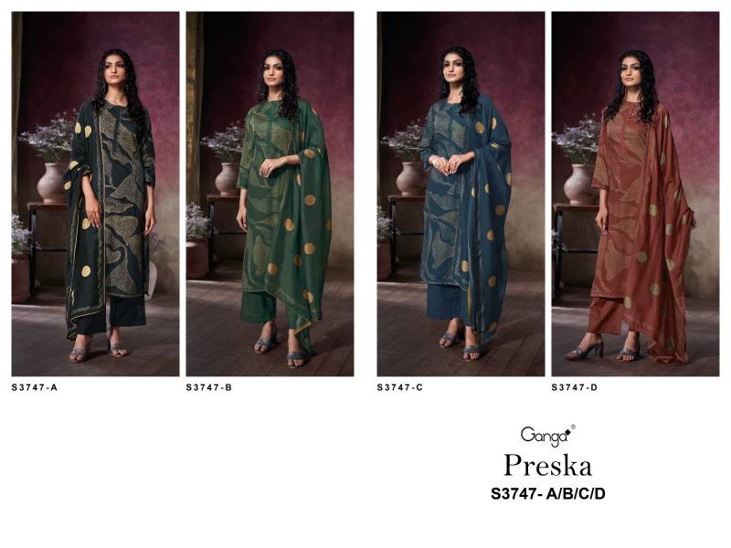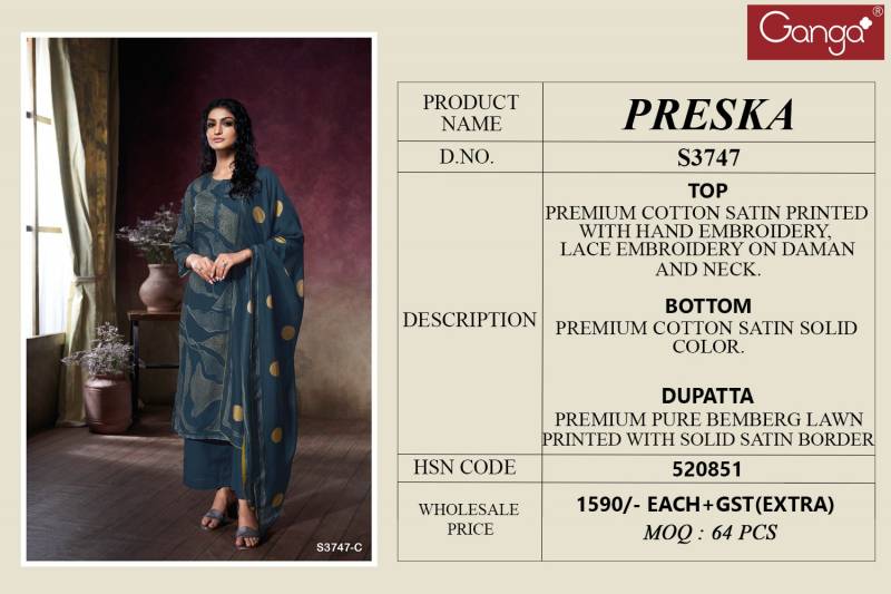Ganga Preska Wholesale Premium Cotton Satin Salwar Suit Collection.