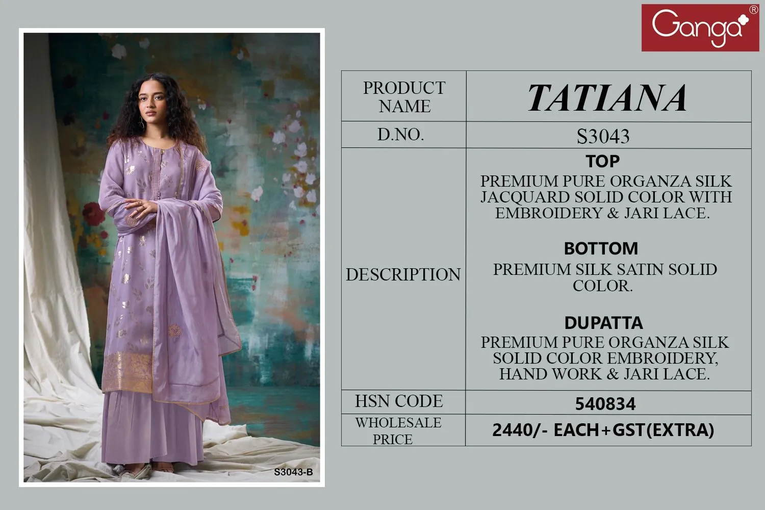Ganga Tatiana 3043 Premium Pure Organza Silk Wholesale Designer Salwar Suit Collection
