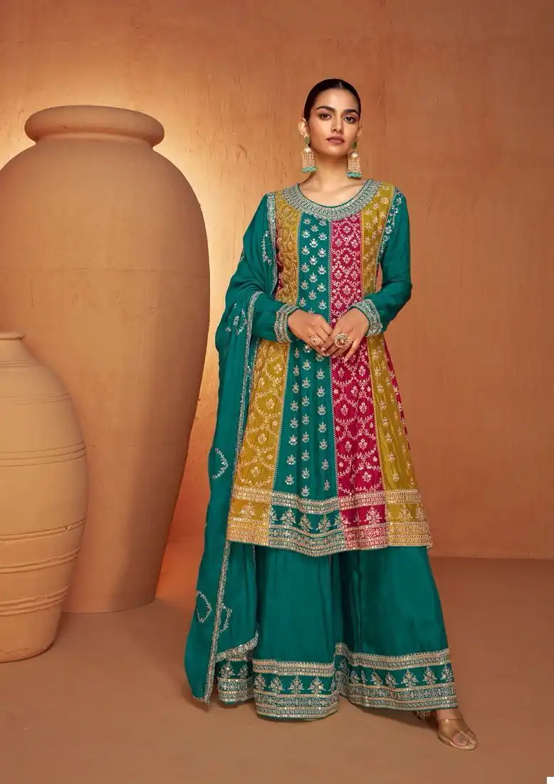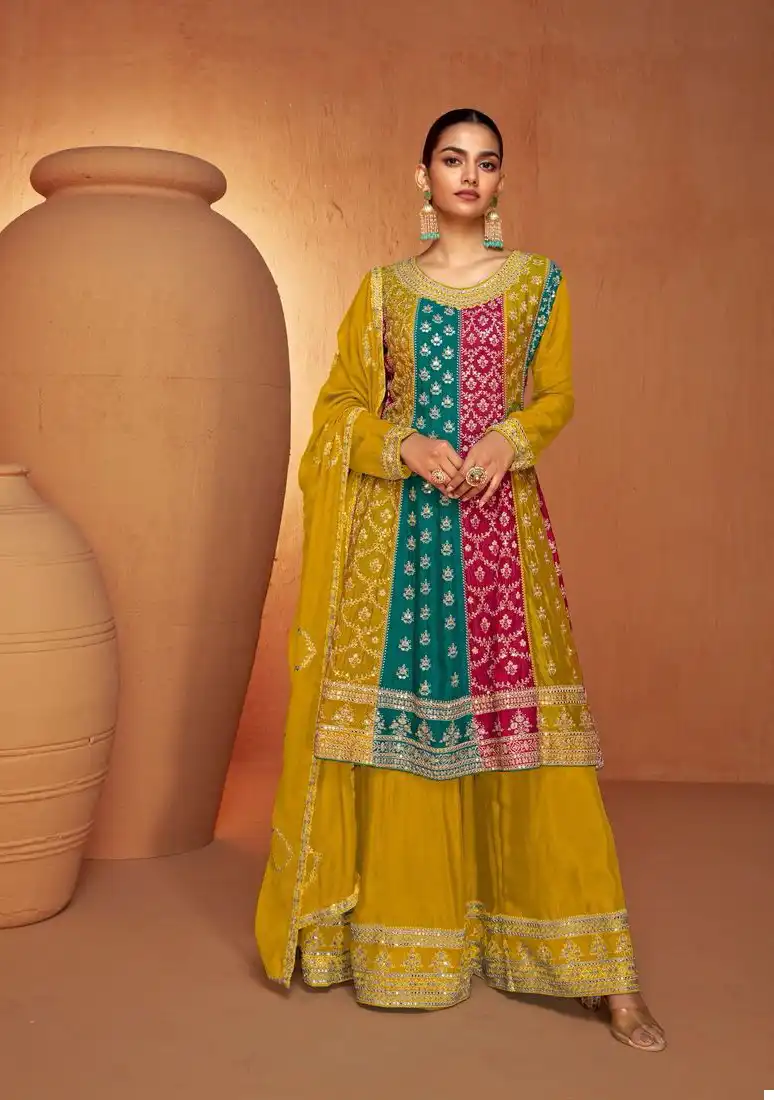- Contemporary Flair: The Ruhi Real Chinon collection seamlessly blends traditional aesthetics with contemporary flair. The modern silhouettes and stylish embellishments make these readymade suits perfect for a variety of occasions, from festive celebrations to formal events.