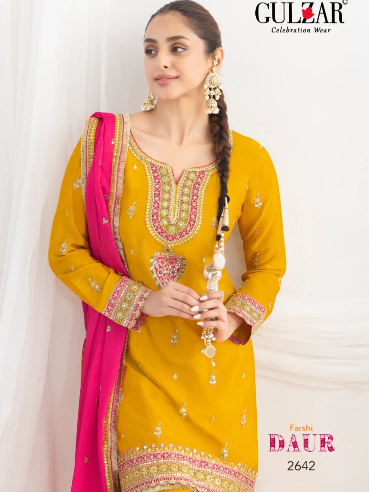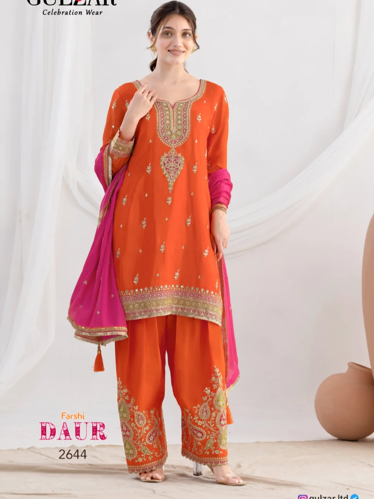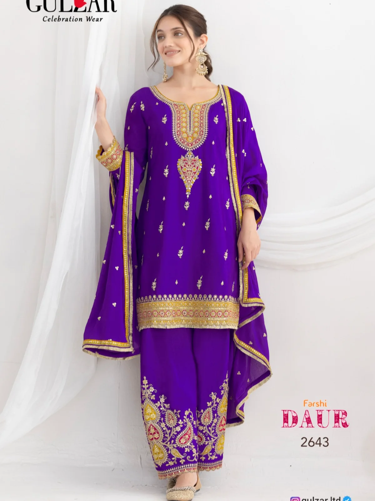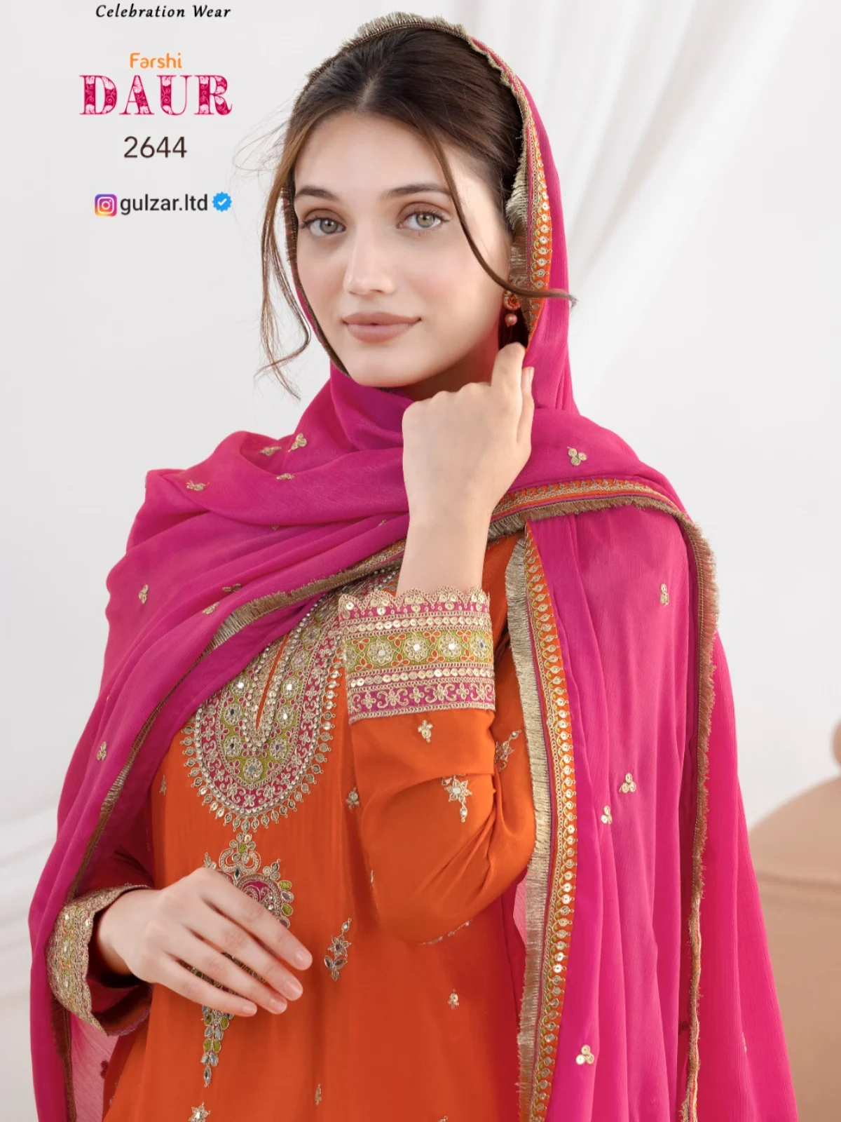 - Experience the beauty of timeless elegance with the Gulzar Ka Daur Farshi Salwar Collection, a luxurious ensemble crafted for women who appreciate classic artistry blended with modern comfort. Available in 4 rich colour options (D.No. 2641–2644), this premium readymade set captures the essence of traditional royal wear, making it perfect for festive celebrations, weddings, cultural events, and grand gatherings.