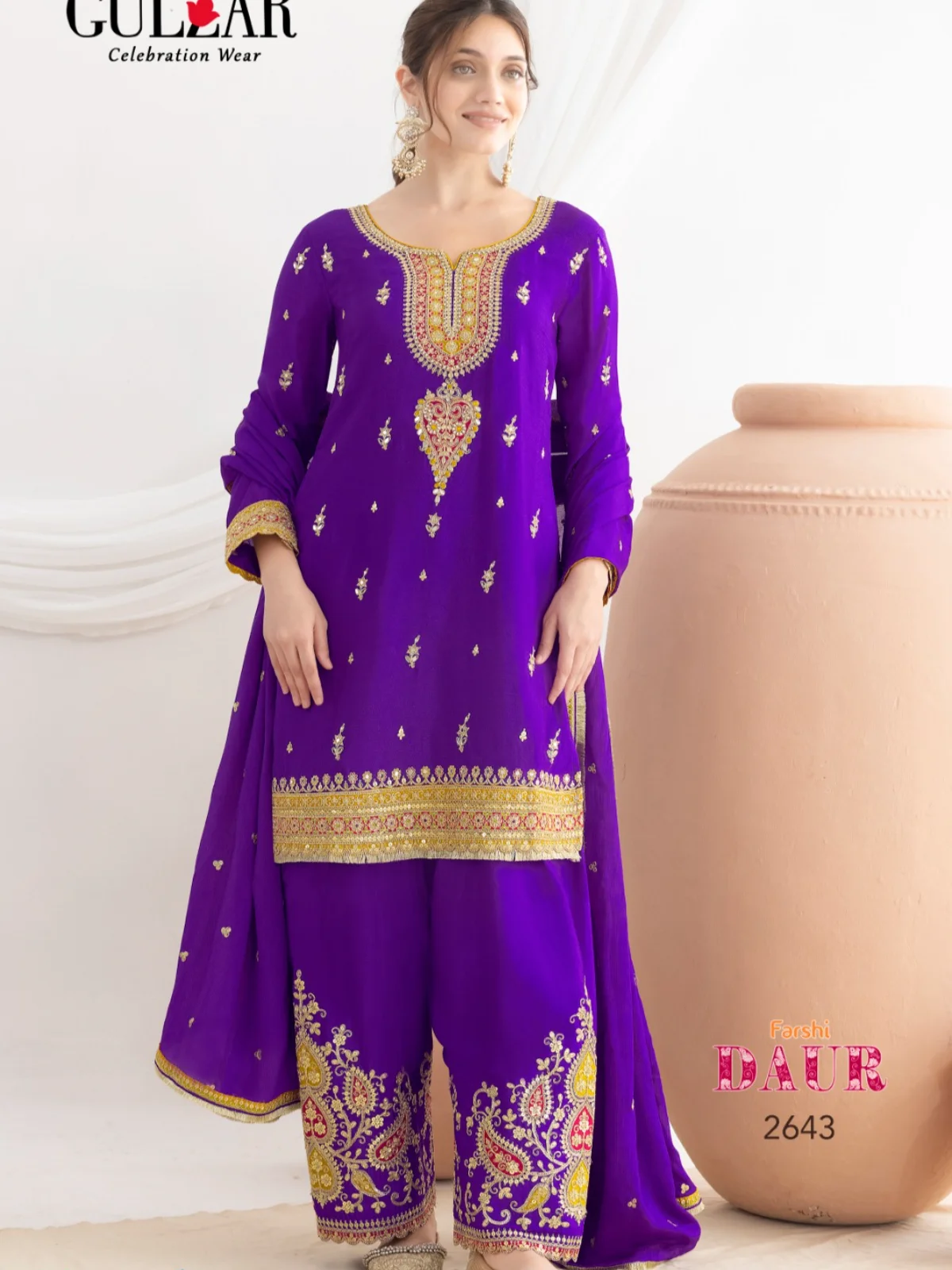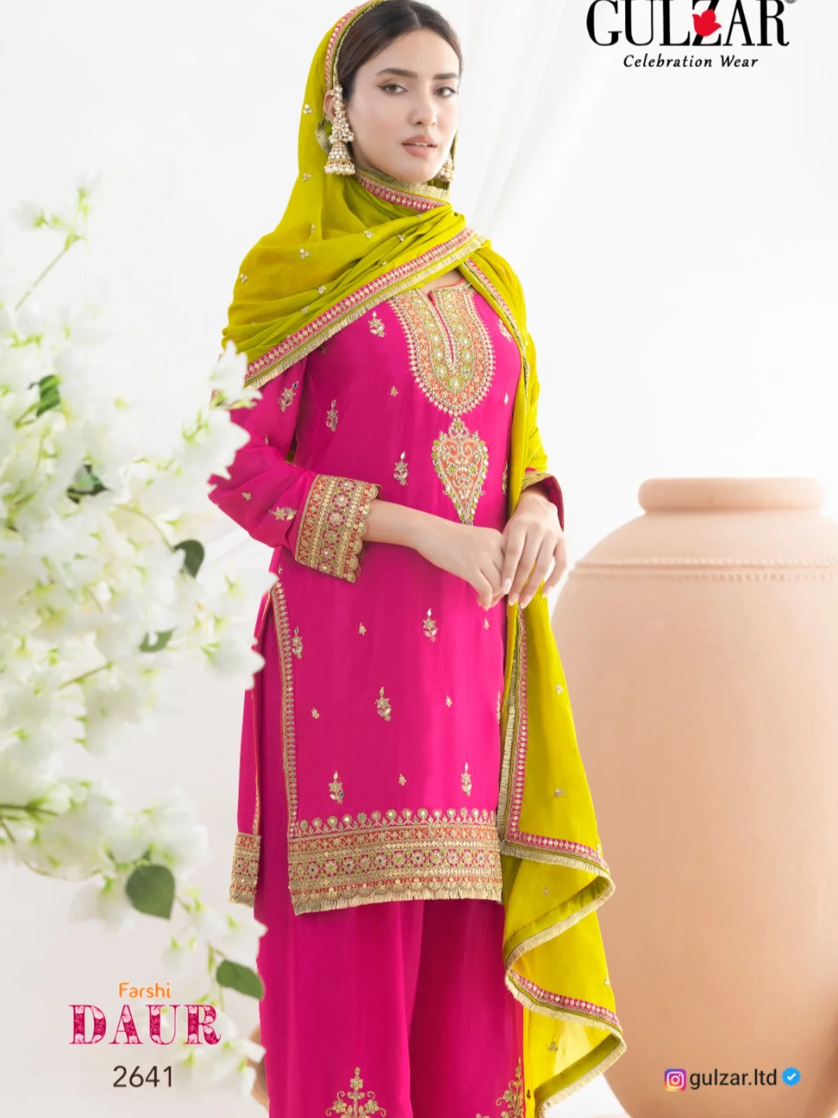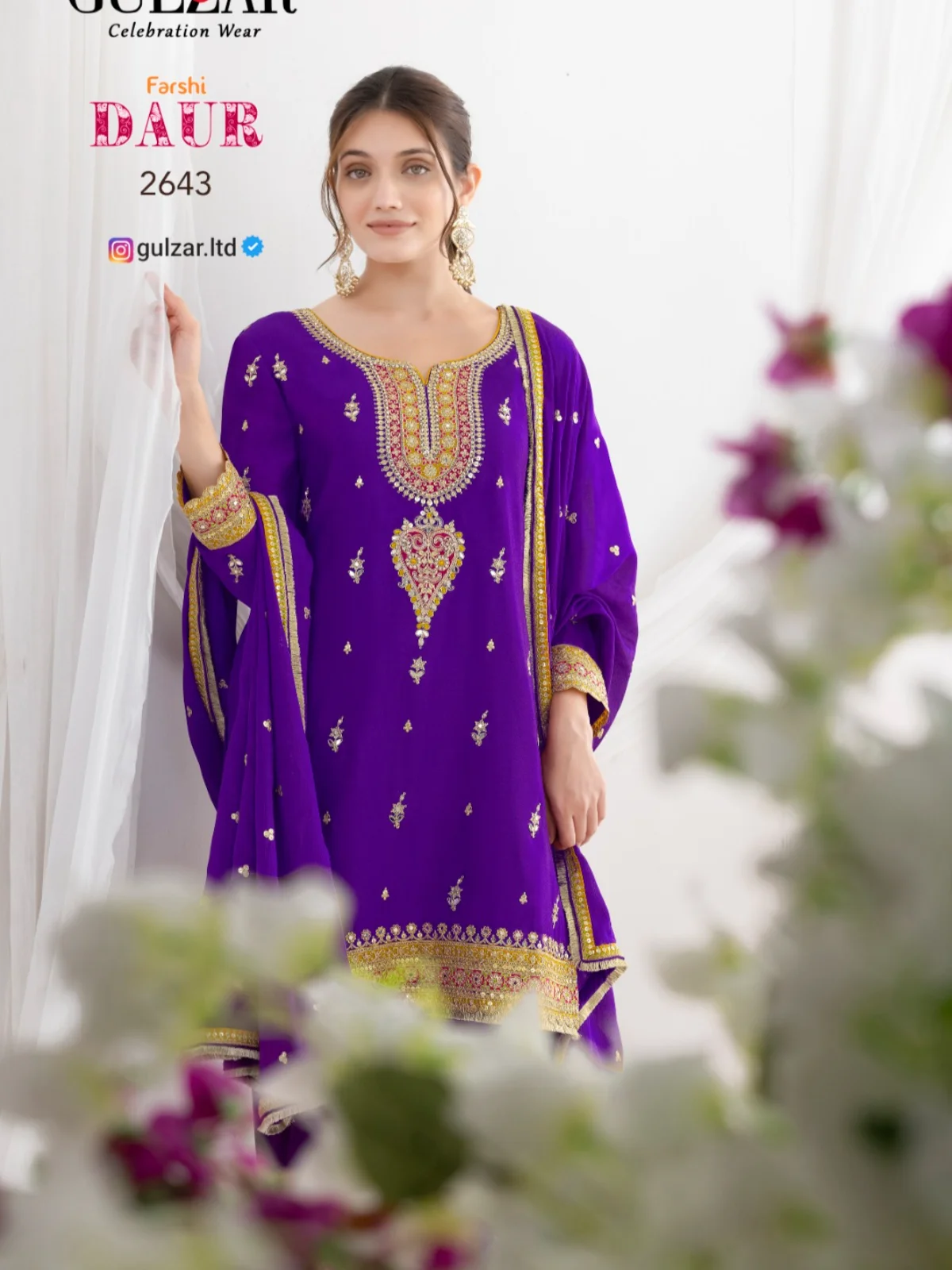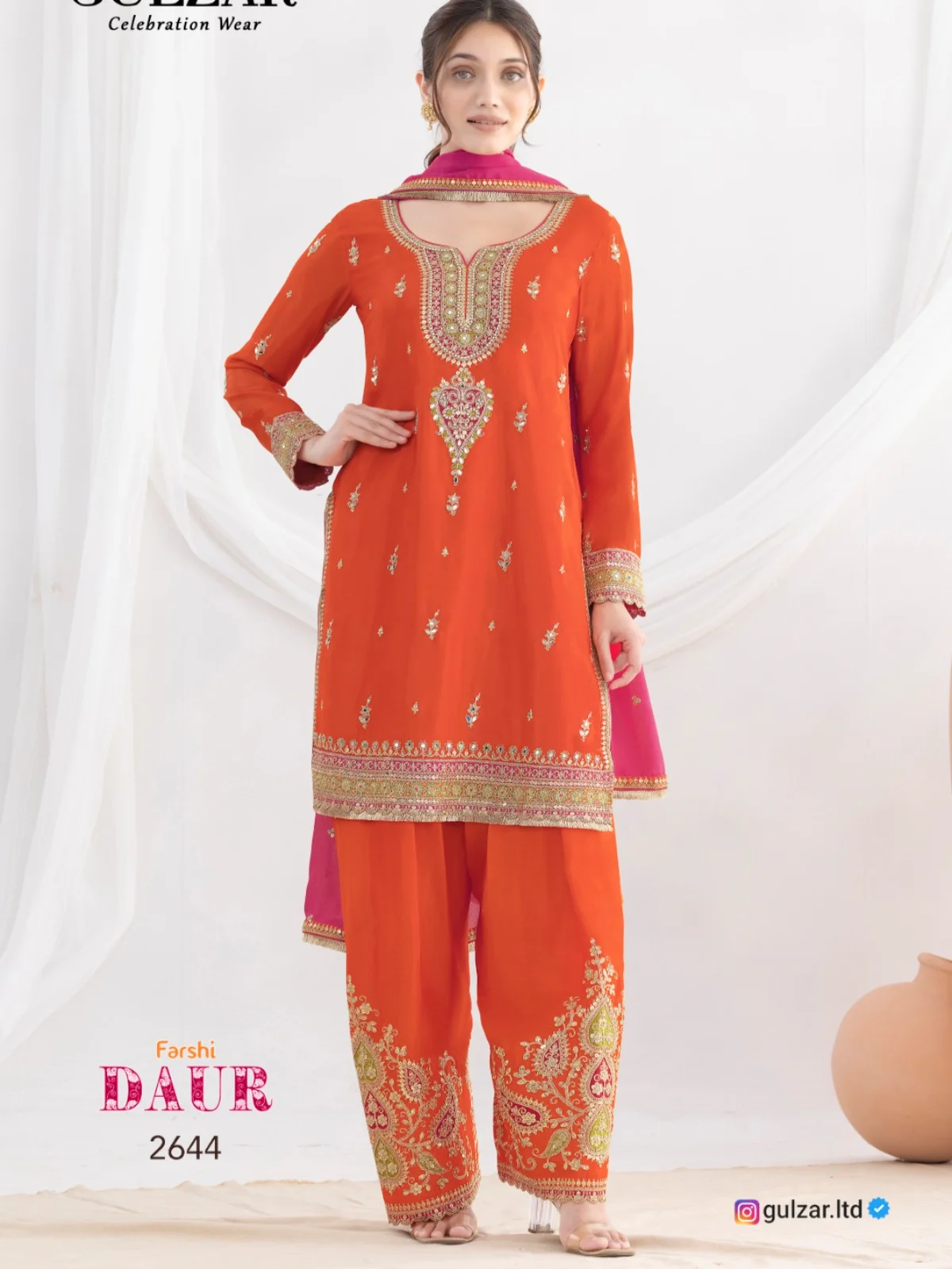 - Experience the beauty of timeless elegance with the Gulzar Ka Daur Farshi Salwar Collection, a luxurious ensemble crafted for women who appreciate classic artistry blended with modern comfort. Available in 4 rich colour options (D.No. 2641–2644), this premium readymade set captures the essence of traditional royal wear, making it perfect for festive celebrations, weddings, cultural events, and grand gatherings.