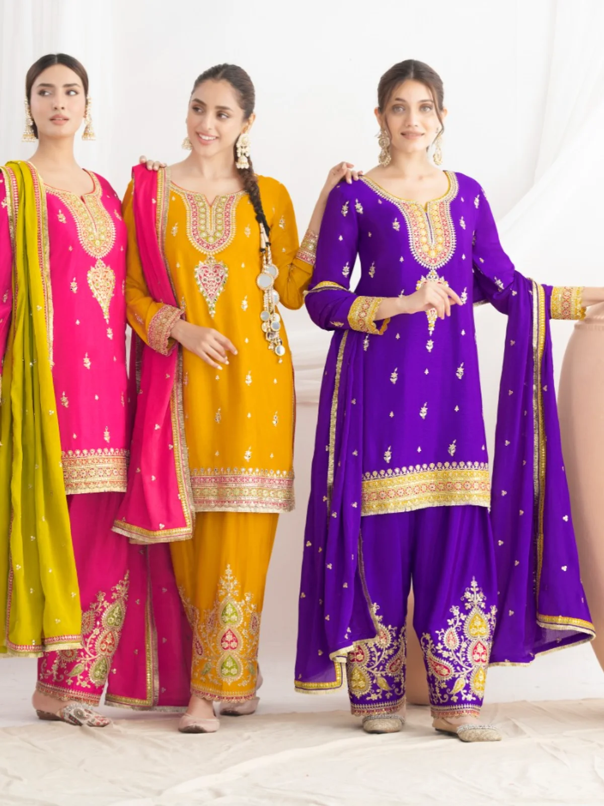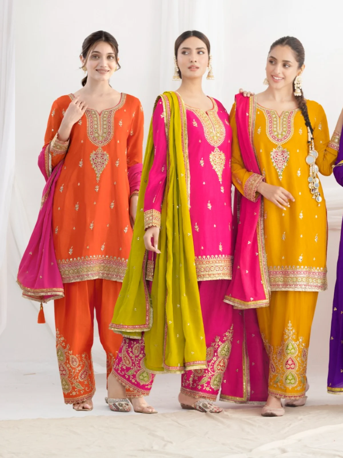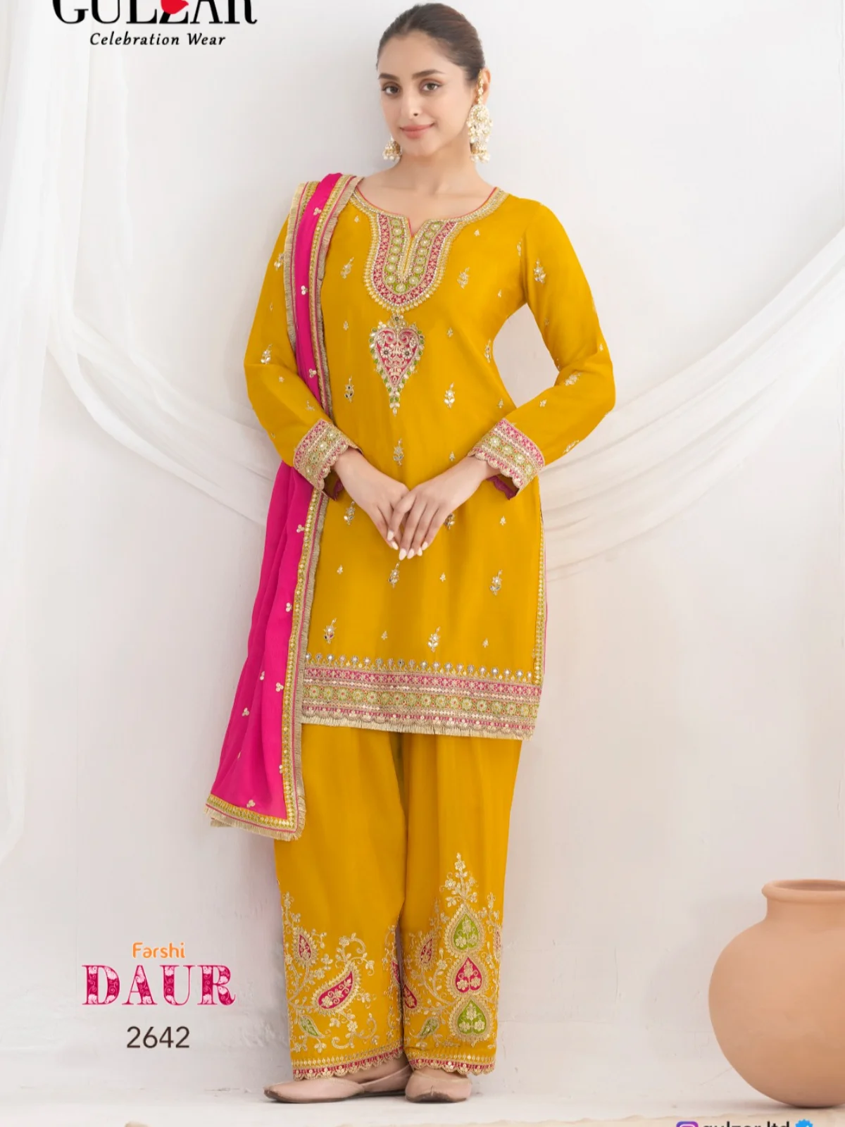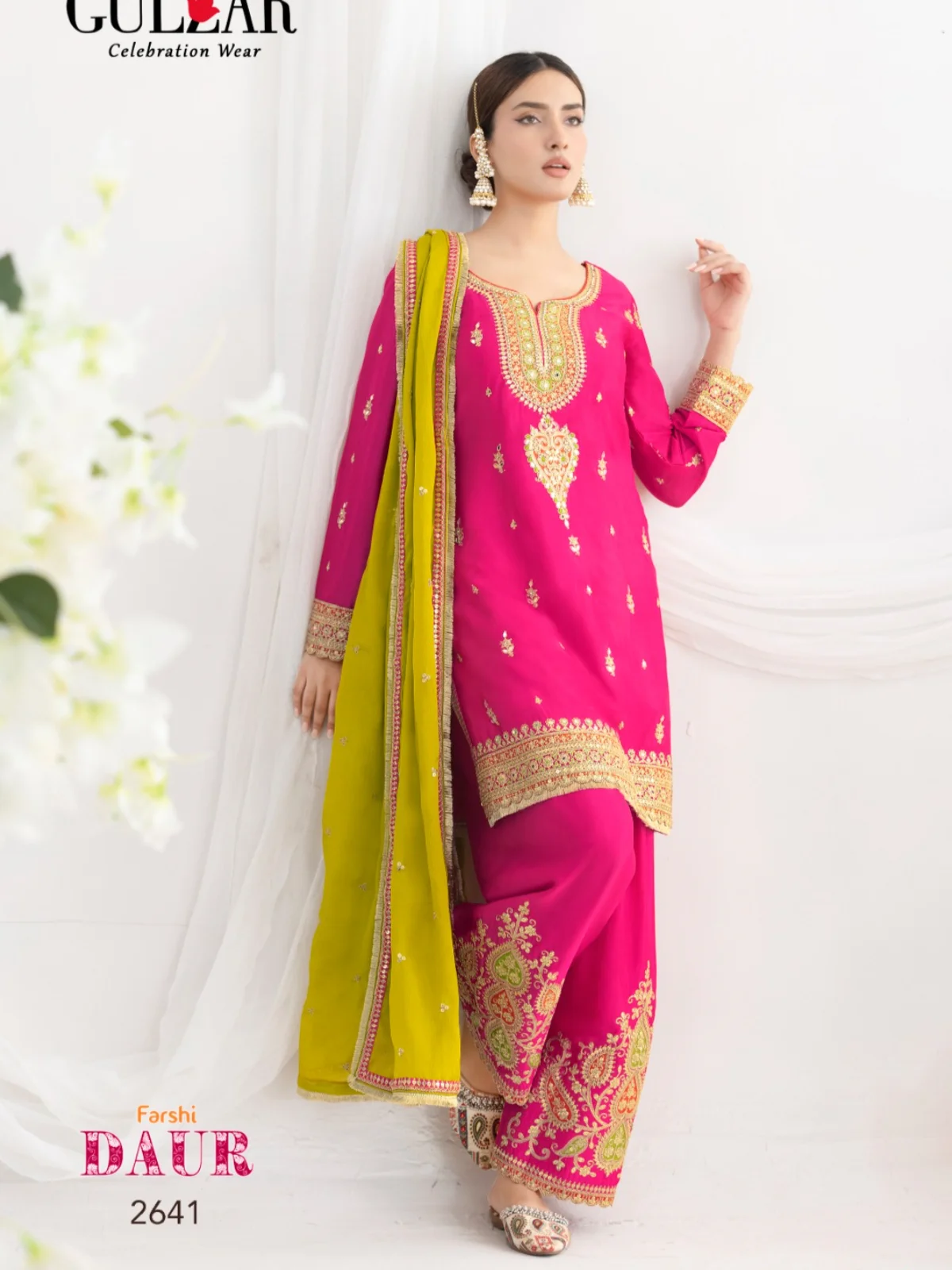 - Experience the beauty of timeless elegance with the Gulzar Ka Daur Farshi Salwar Collection, a luxurious ensemble crafted for women who appreciate classic artistry blended with modern comfort. Available in 4 rich colour options (D.No. 2641–2644), this premium readymade set captures the essence of traditional royal wear, making it perfect for festive celebrations, weddings, cultural events, and grand gatherings.