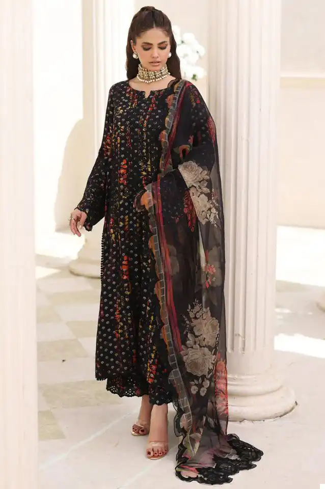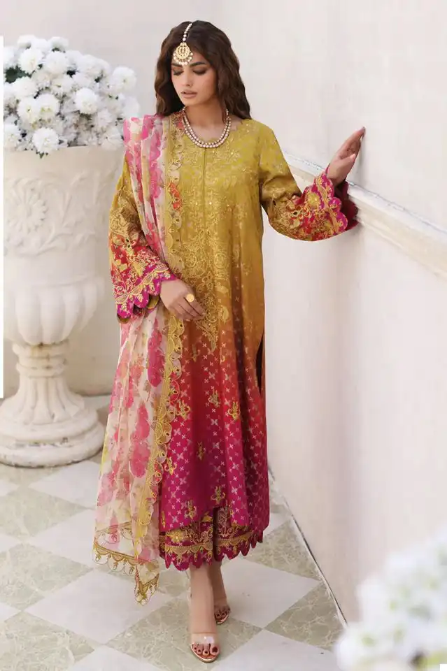 The ensemble is priced at RS750 for the chiffon option and RS799 for the cotton option per piece, offering excellent value for its premium-quality fabrics and intricate detailing.