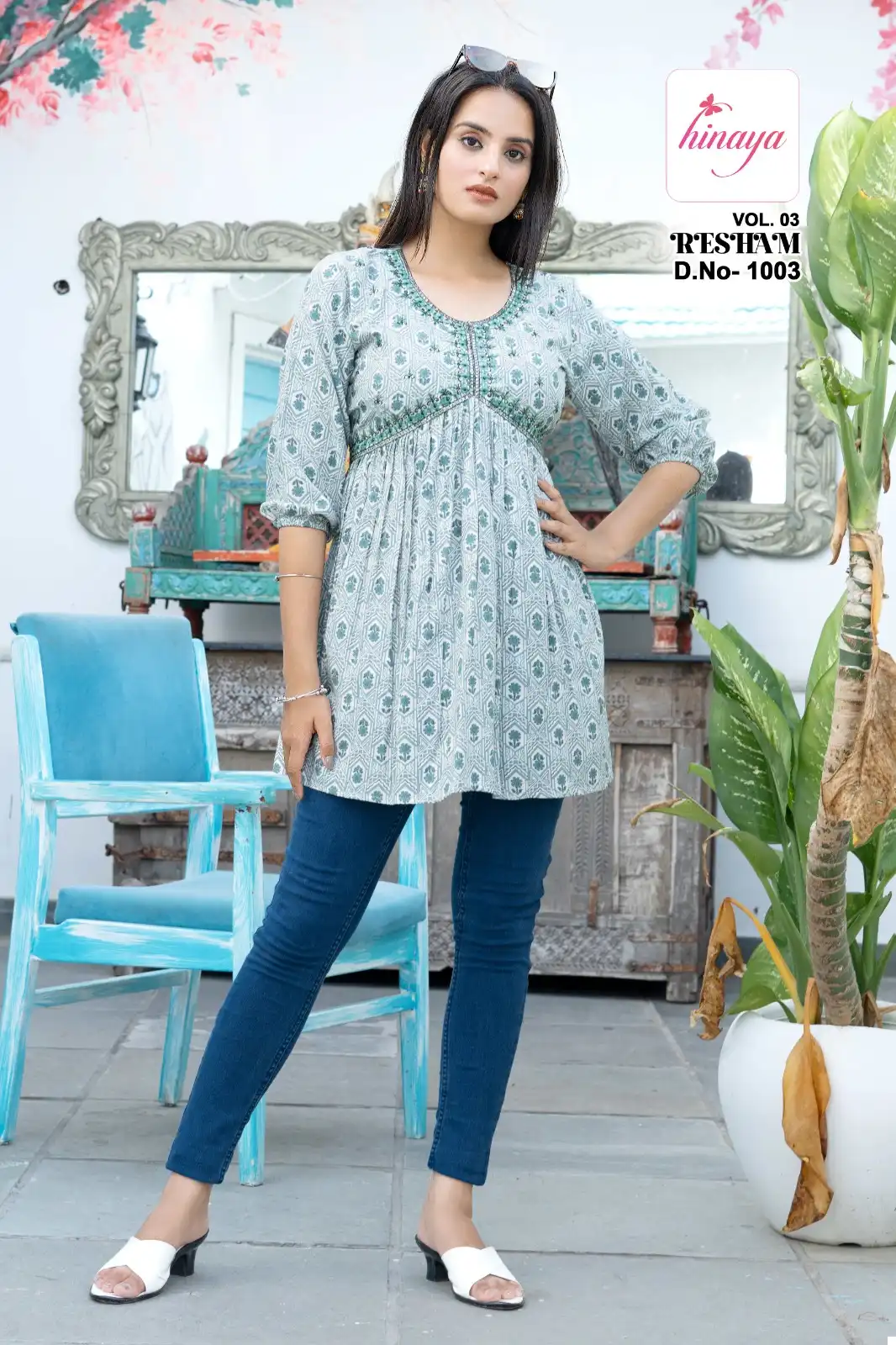- Printed Designs: Resham Vol 3 boasts a stunning array of printed designs, ranging from contemporary patterns to traditional motifs. The intricate prints add a touch of sophistication to each kurti, making them suitable for a variety of style preferences.
