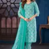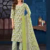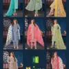 This information describes a set of clothing, likely a collection of straight-cut festive wear kurtis with matching bottoms and dupattas: