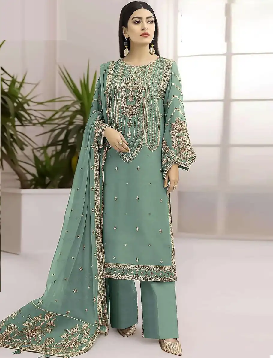 - Dupatta: A Georgette dupatta accompanies the set, perfectly harmonizing with the top’s fabric. The light and airy nature of the Georgette dupatta adds an element of elegance, gracefully completing the ensemble.