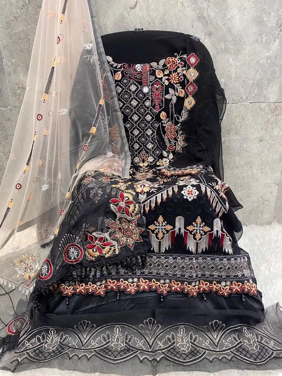 Dupatta: Completing the ensemble is a heavy net dupatta that adds an extra layer of glamour to your look. The intricate detailing and luxurious texture of the net fabric exude sophistication, making it perfect for special occasions and festive celebrations. Whether draped gracefully over your shoulders or styled in various ways, the heavy net dupatta enhances the overall appeal of your ensemble with its exquisite beauty.