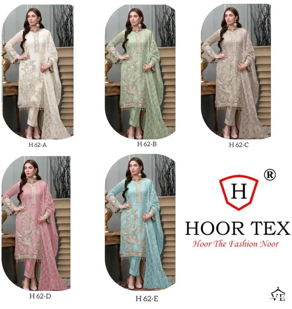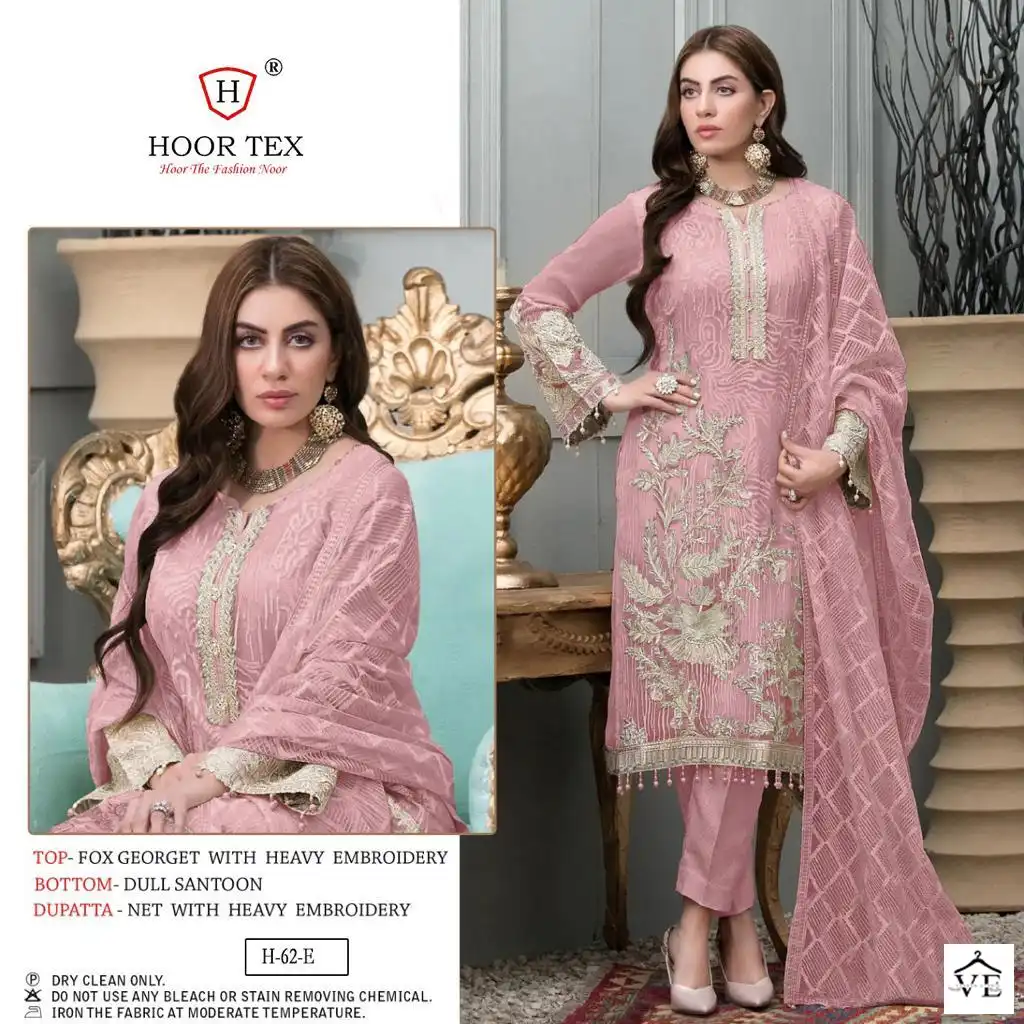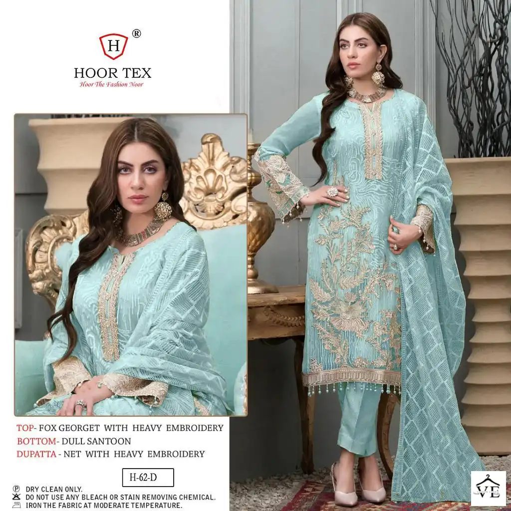 Hoor Tex H-62 Heavy Georgette Wholesale Pakistani Suit Catalog of 5 Pcs. We deal in Kurtis, Sarees, Dresses Materials, Leggings, and Designer Salwar Kameez.