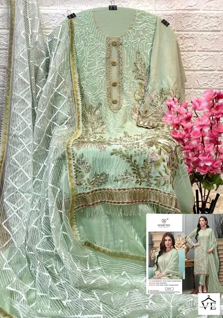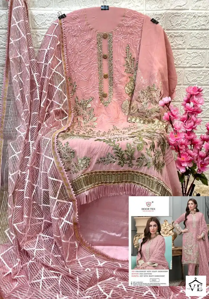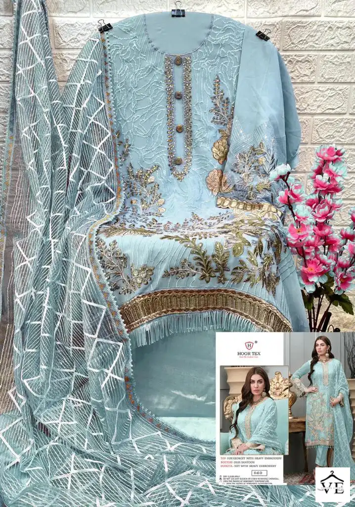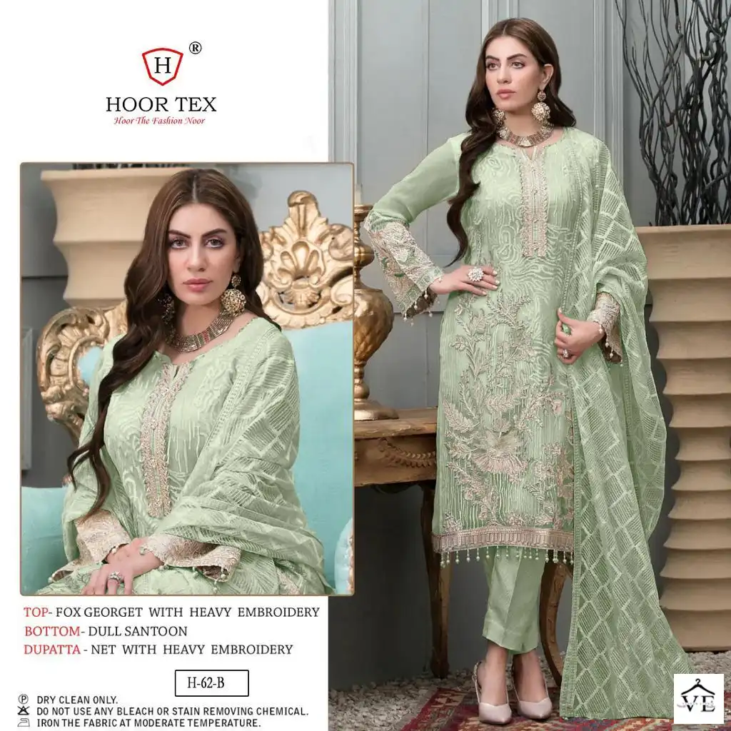 Hoor Tex H-62 Heavy Georgette Wholesale Pakistani Suit Catalog of 5 Pcs. We deal in Kurtis, Sarees, Dresses Materials, Leggings, and Designer Salwar Kameez.