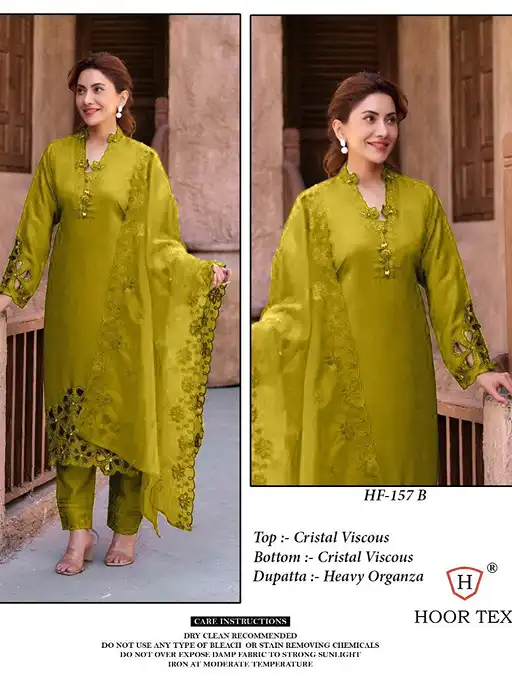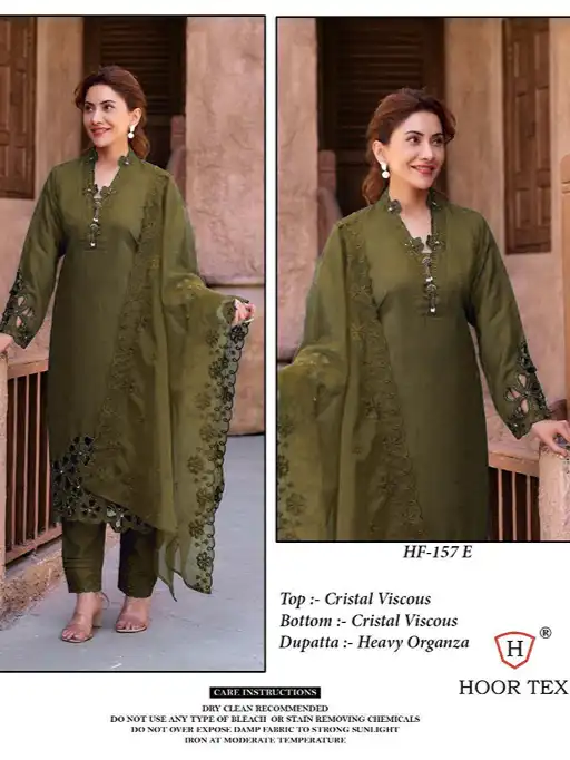 Shop Hoor Tex HF-157 Designer Suit Sets crafted in premium Crystal Viscose with a heavy organza dupatta, available in sizes XL and XXL at ₹1600 + GST.