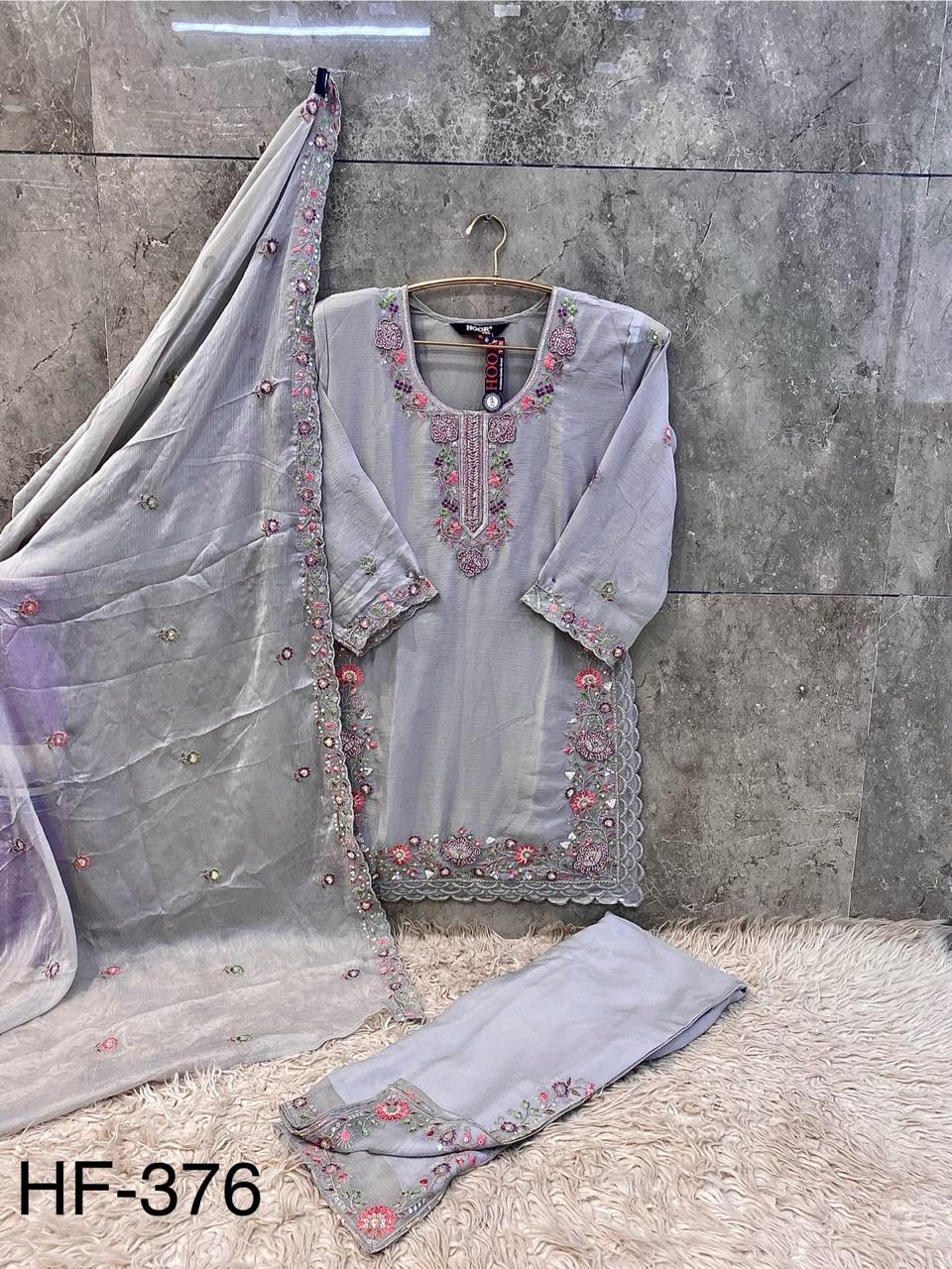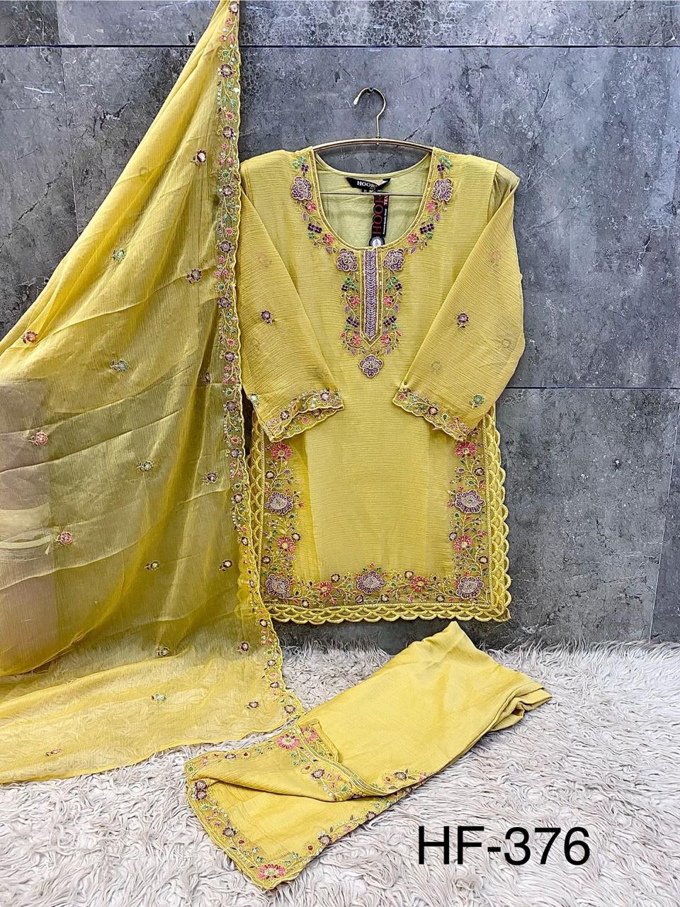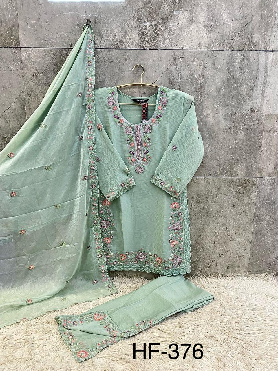 Introducing Hoor Tex’s latest Pakistani Full Stitched Collection – an elegant ensemble crafted from premium chiffon fabric, designed for a graceful festive look.