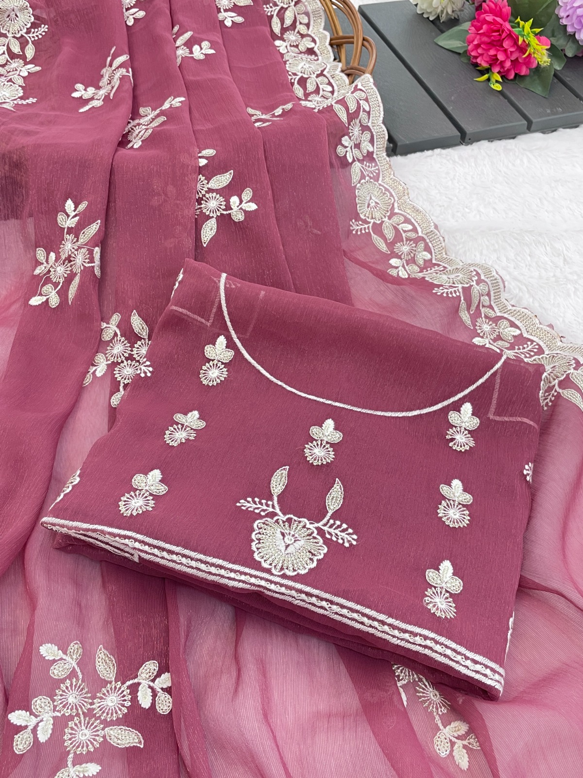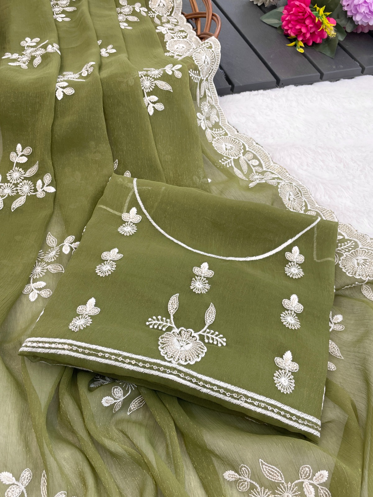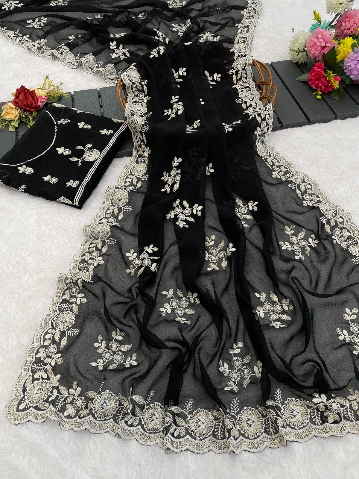 Saree Shimmer Silk with Sequence Embroidery Work and Beautiful Arc Cutting Border