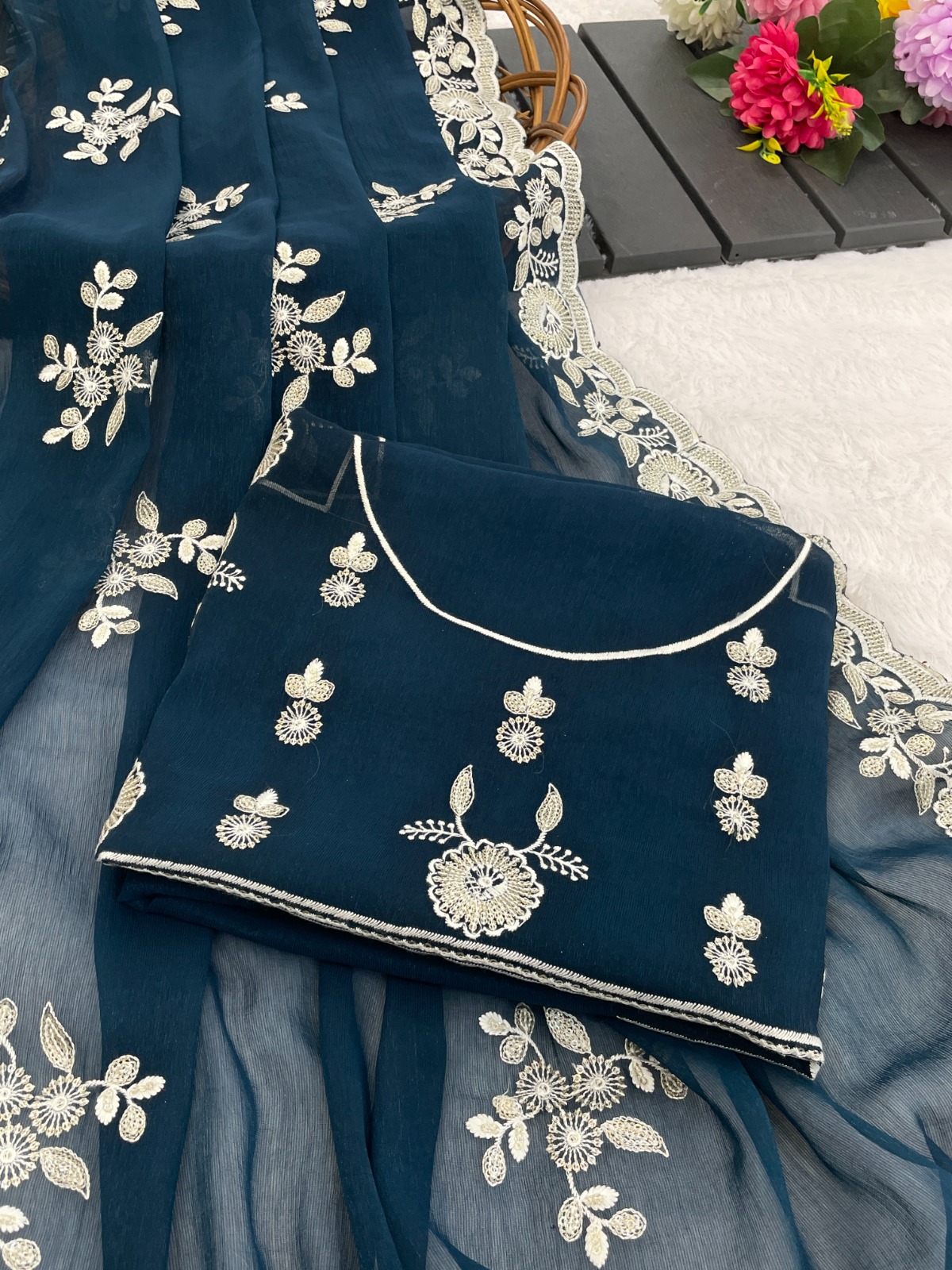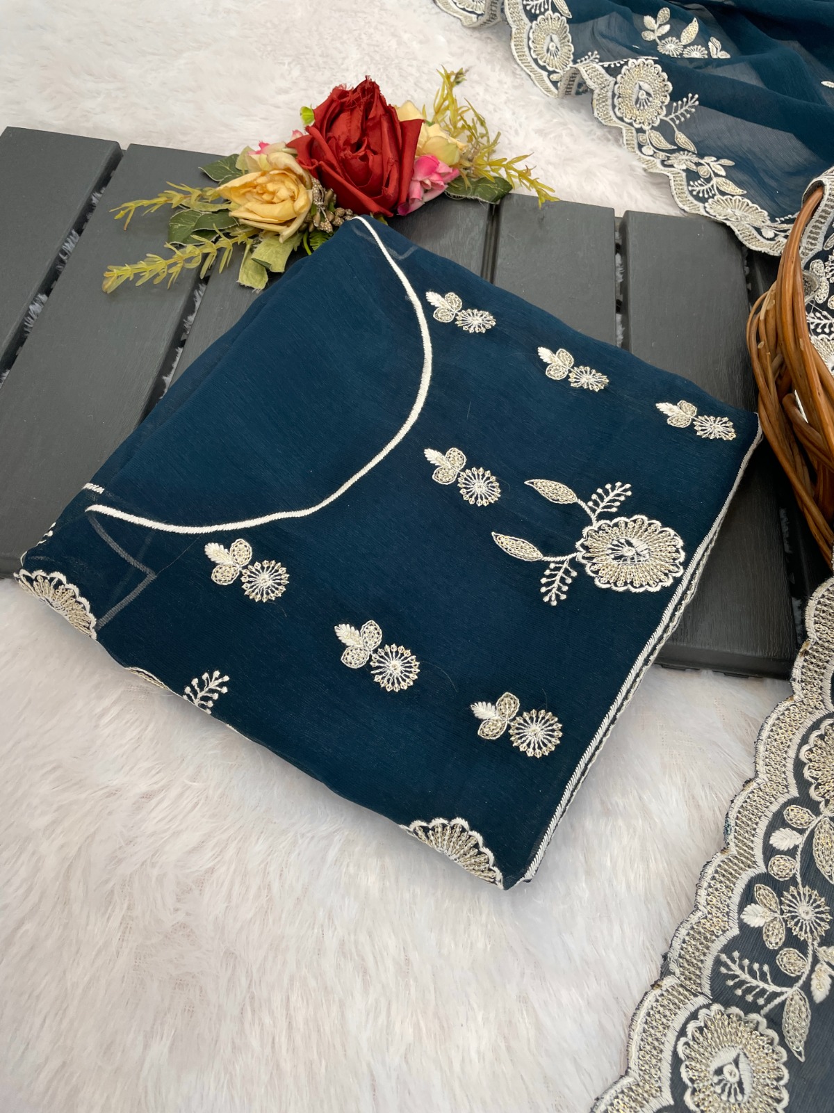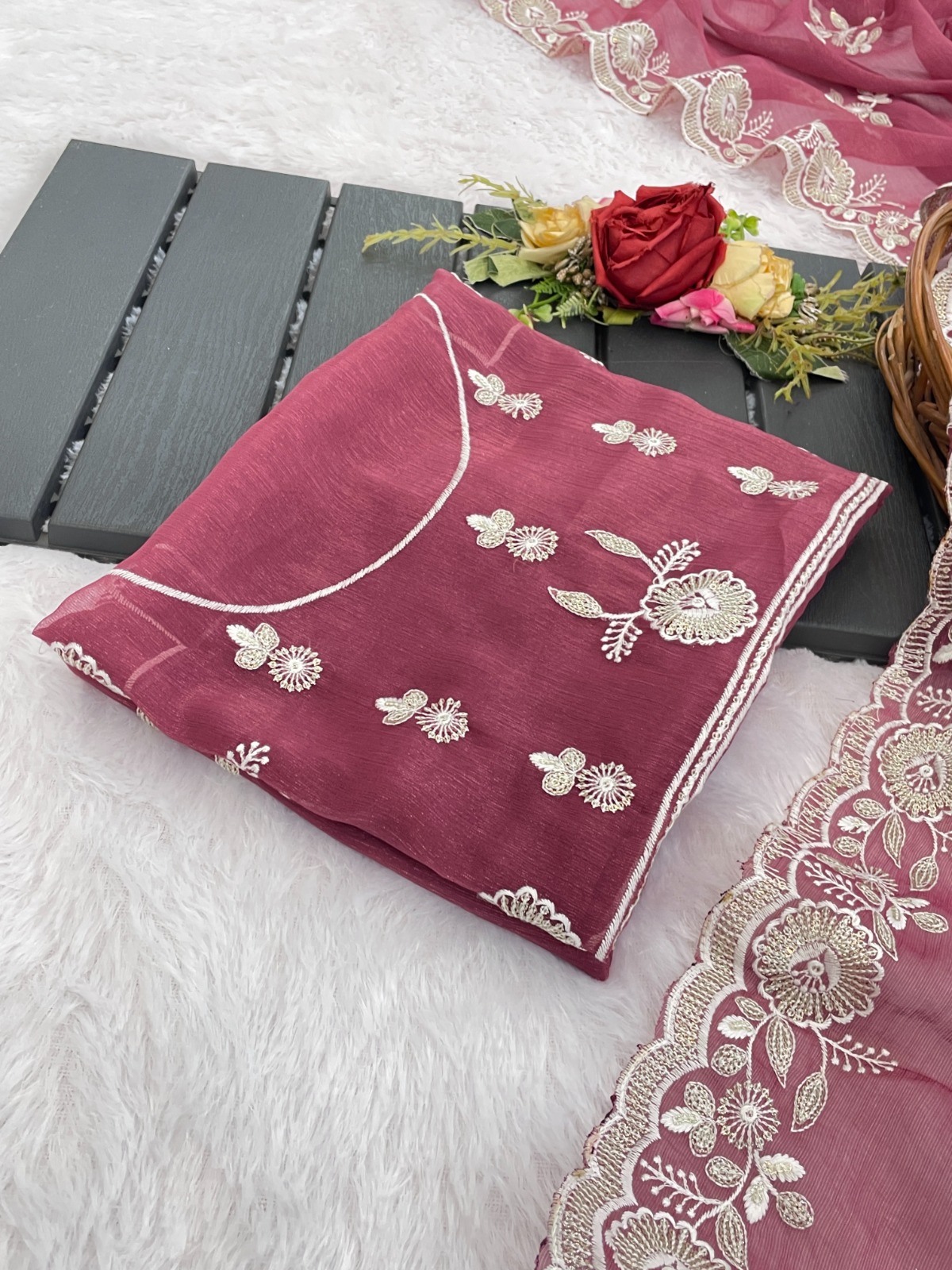 Saree Shimmer Silk with Sequence Embroidery Work and Beautiful Arc Cutting Border